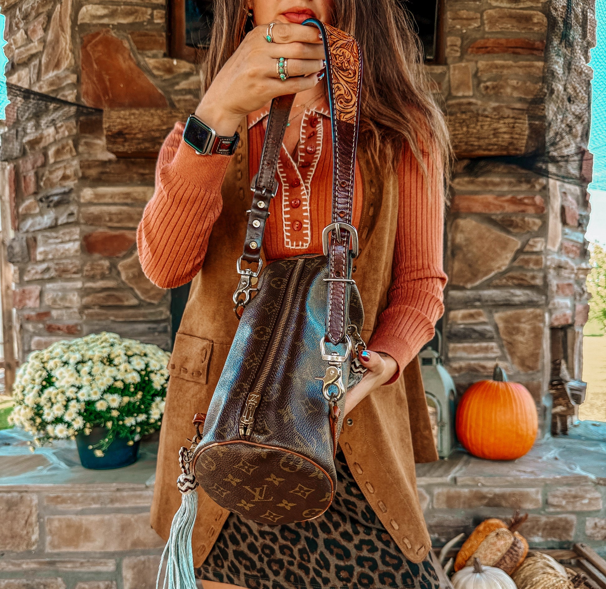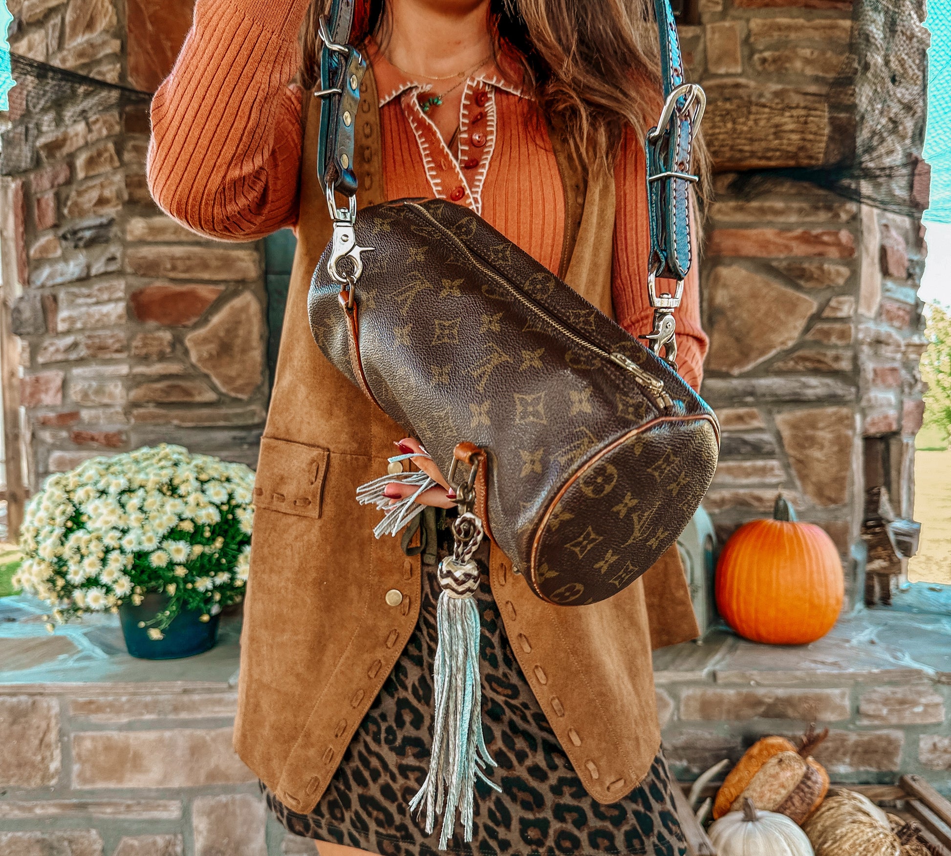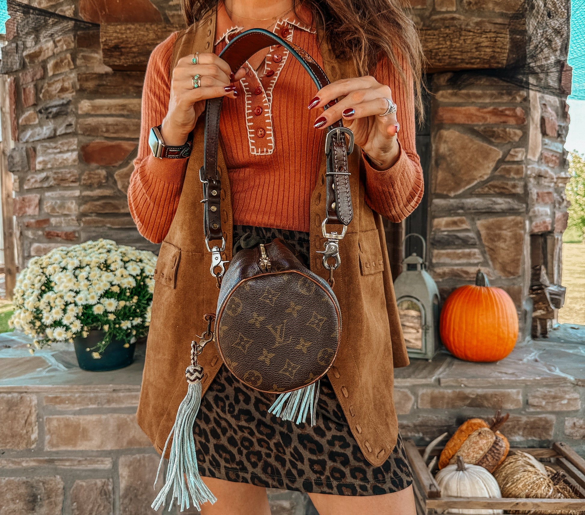 Original hand straps have been removed and replaced with a tall leather detachable shoulder strap. Along with two detachable cowhide fringe keychains.