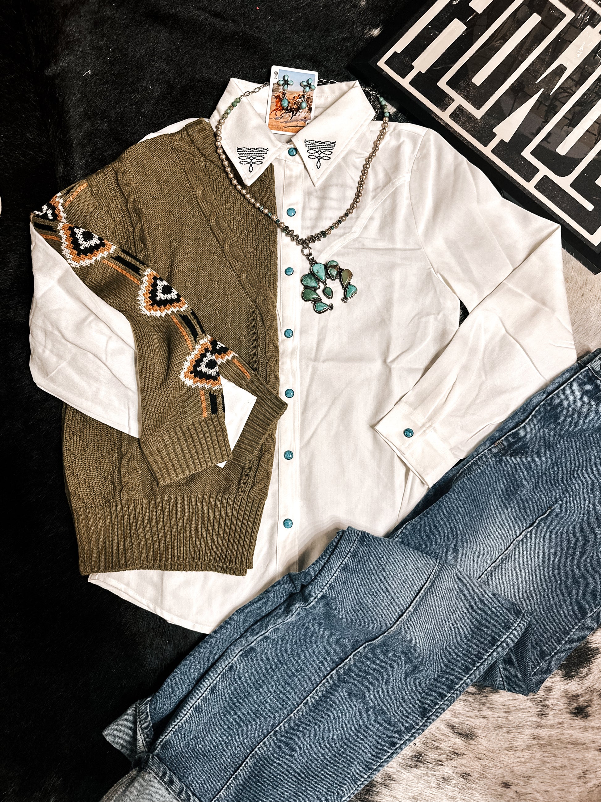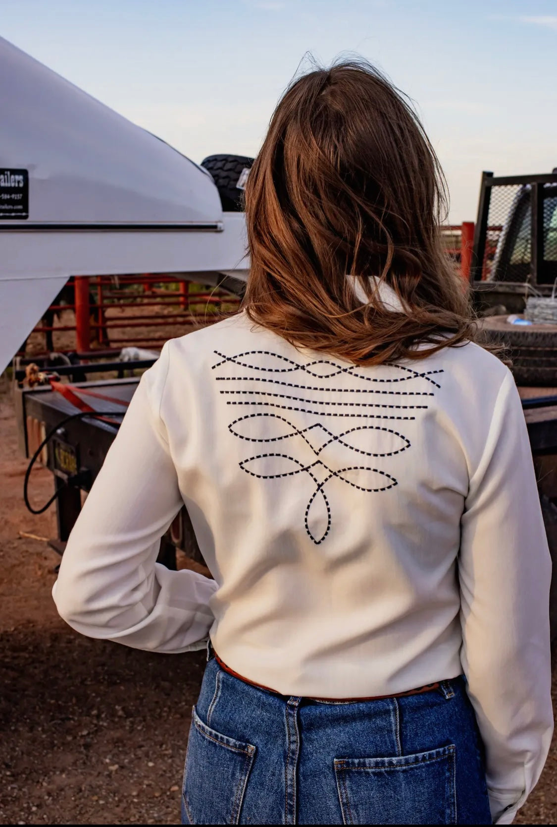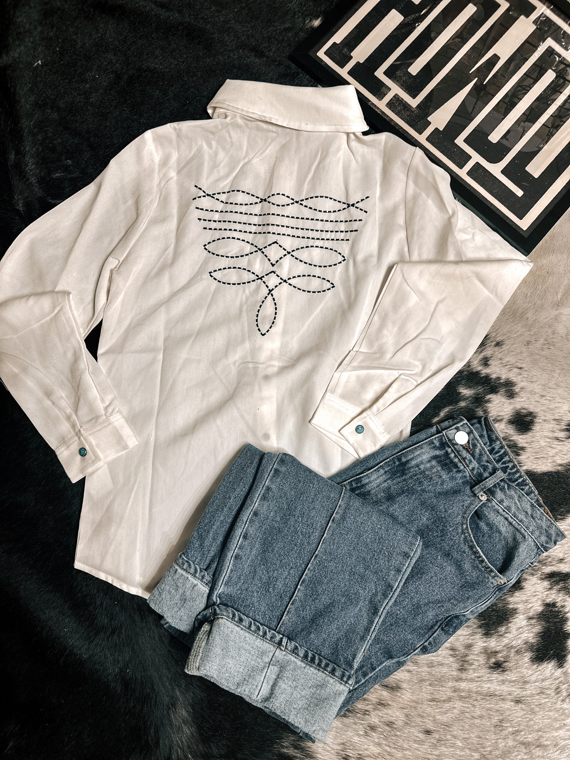 Take a risk and stand out with our handmade Texas turquoise pearl snap. The boot stitching on the back and collar adds a unique touch. Embrace your adventurous spirit with this one-of-a-kind shirt.