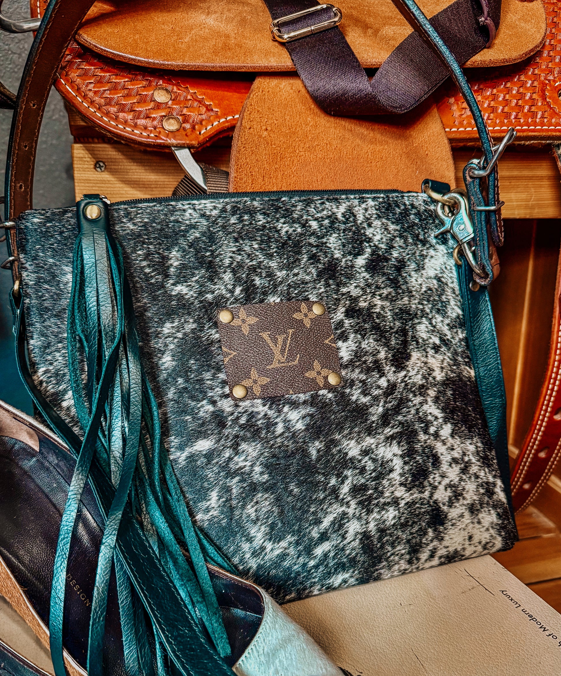 Authentic Patch on genuine leather black and white cowhide bag. The bag pictured is the exact hide we have instock!