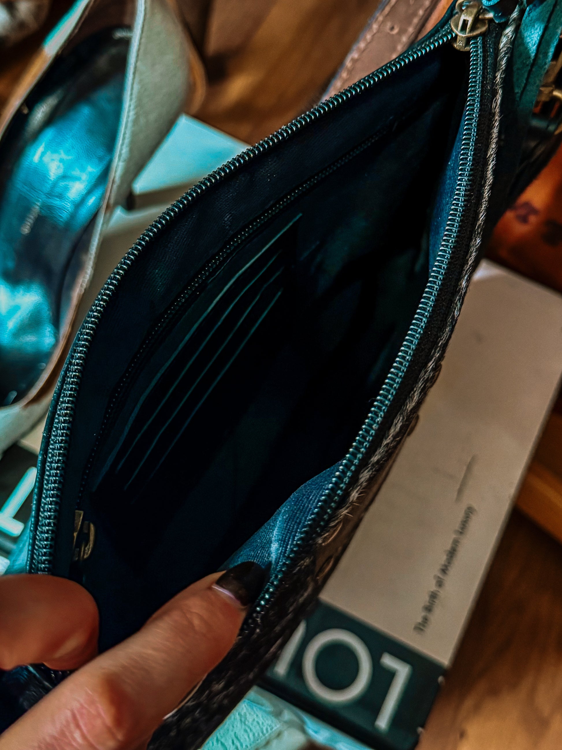 detachable tooled leather & leopard shoulder strap.