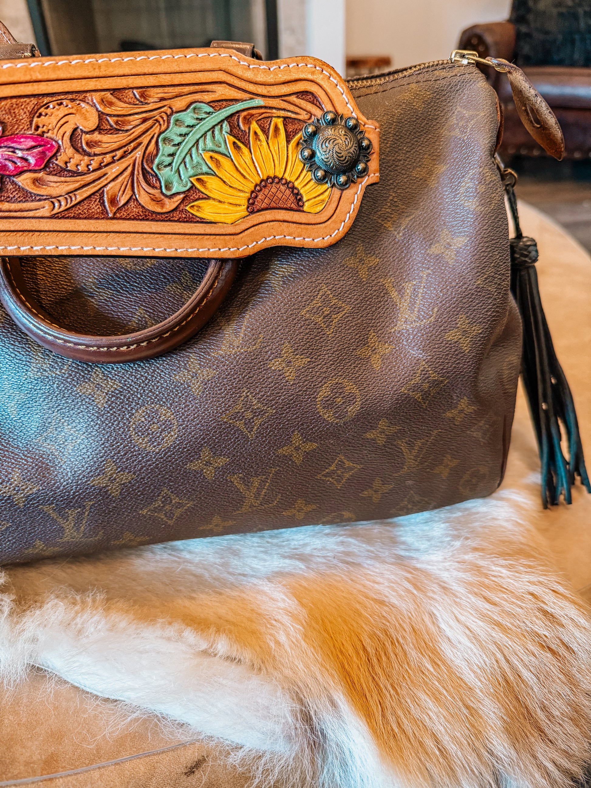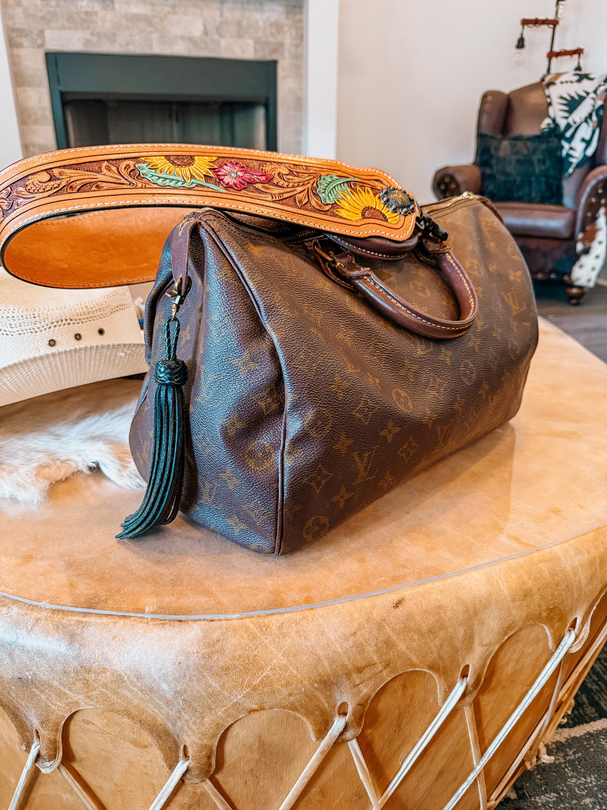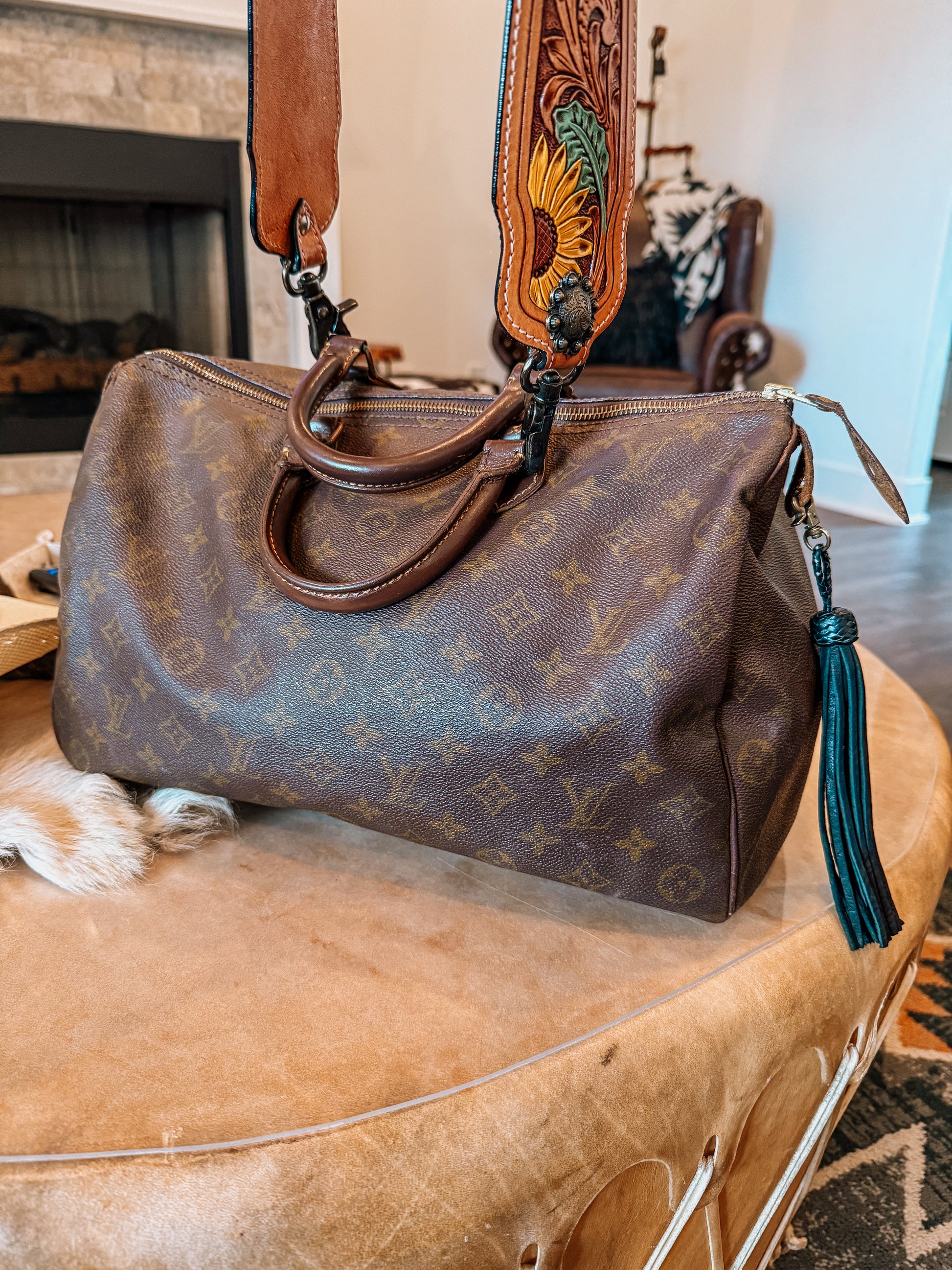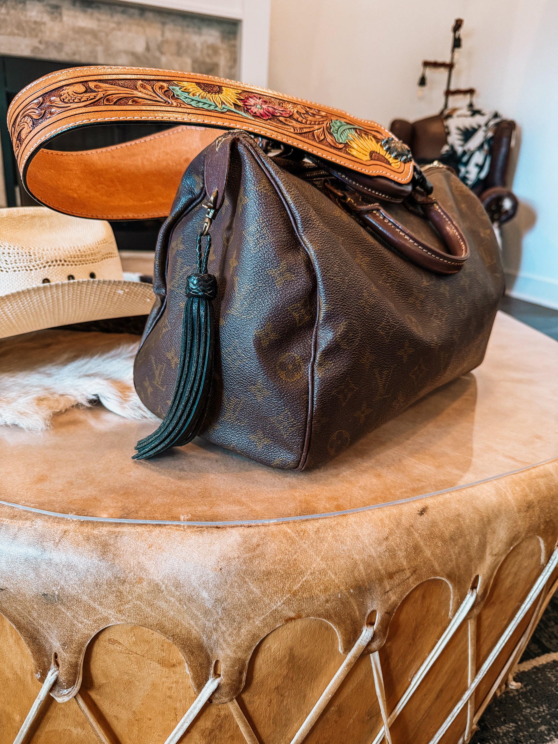 Added hand tooled leather shoulder strap & two leather fringe key chains on each side.