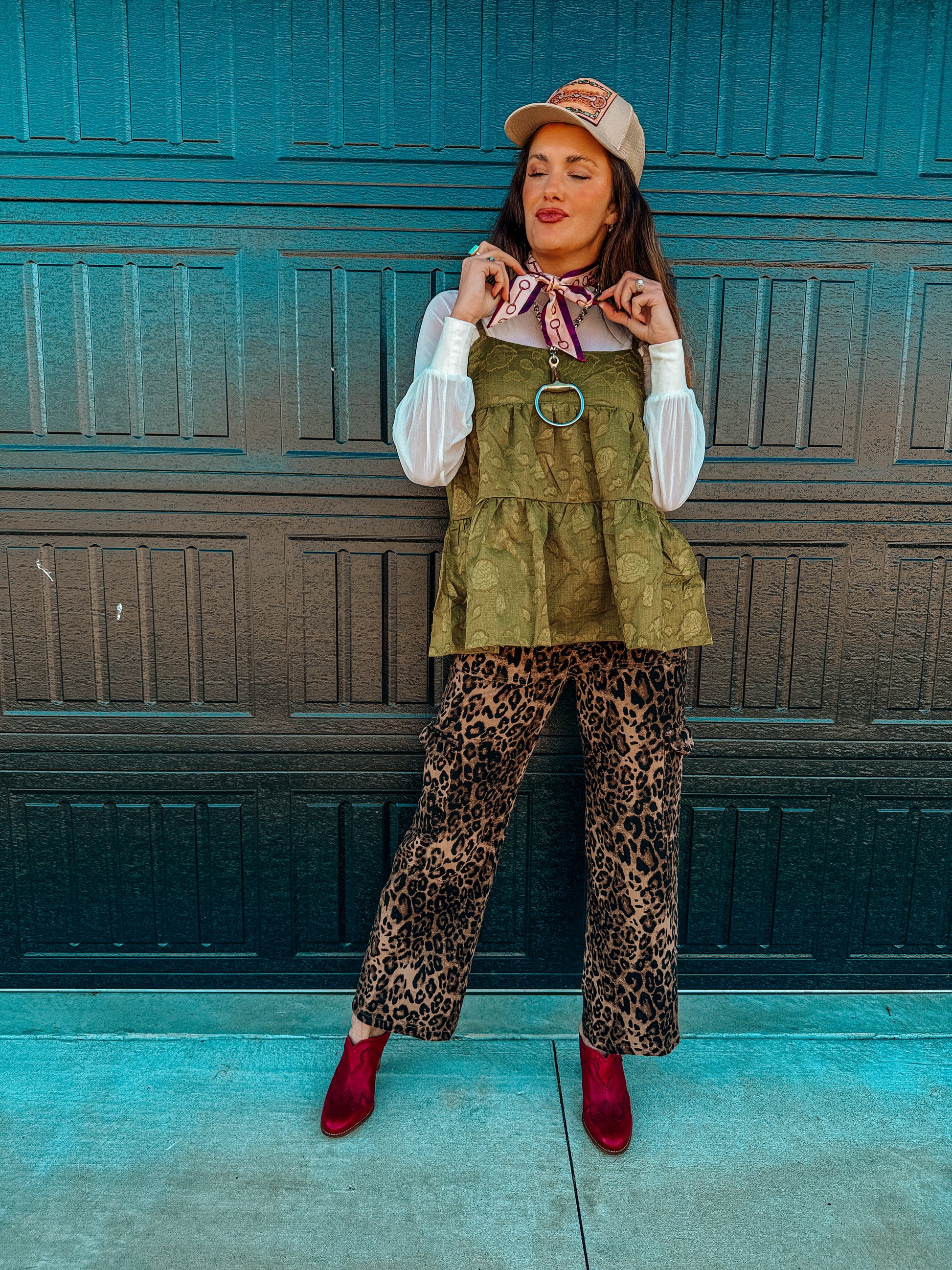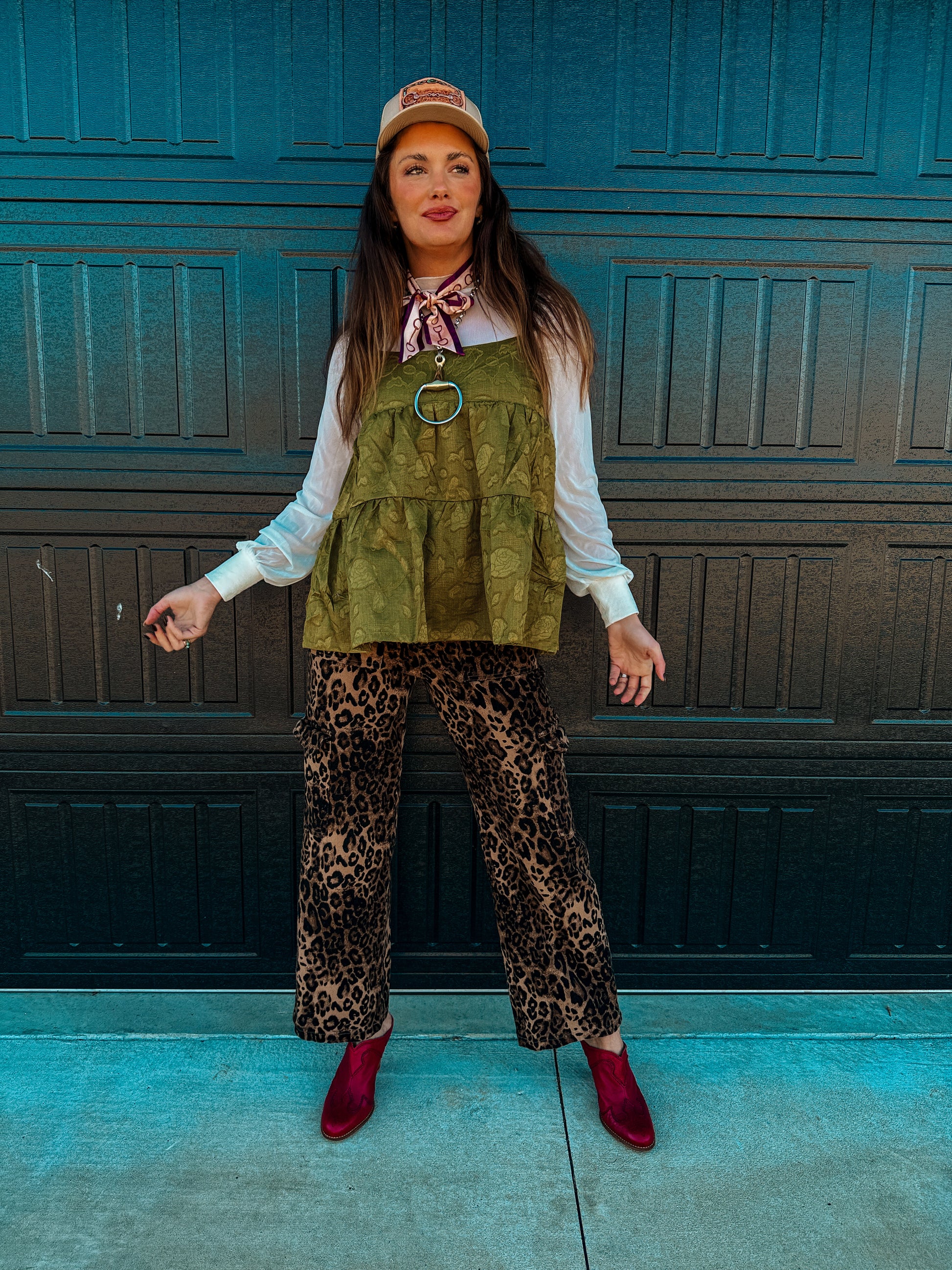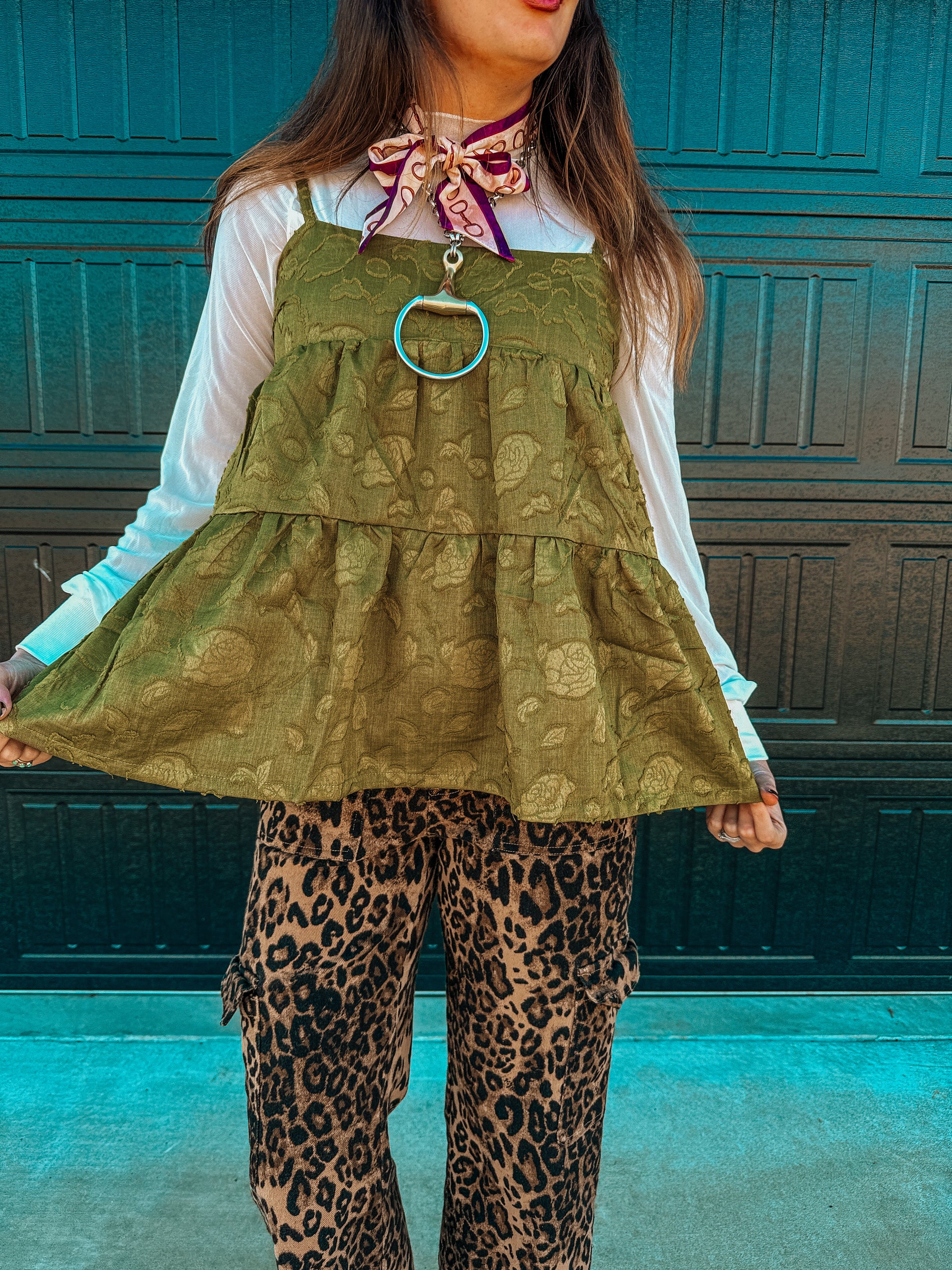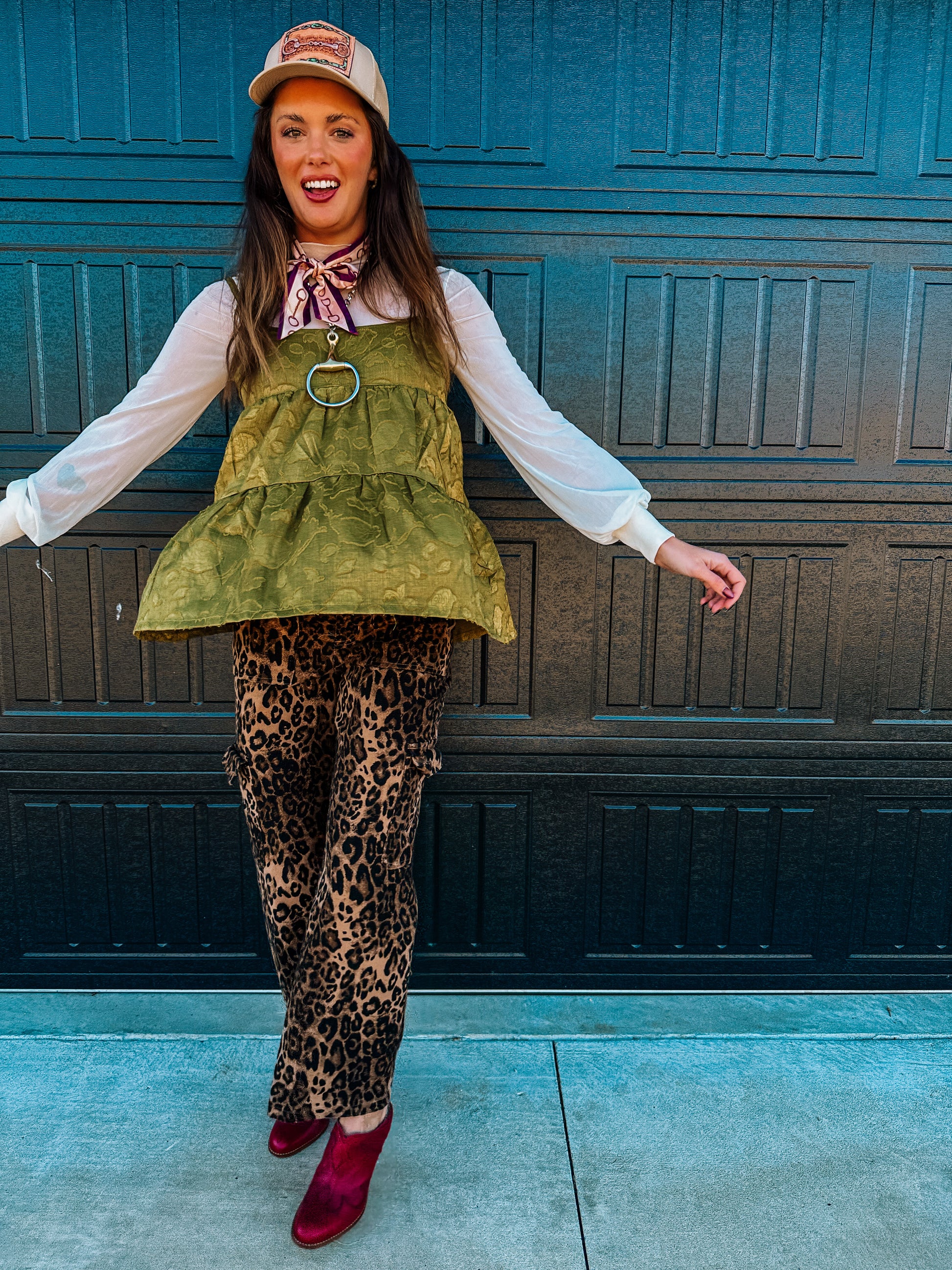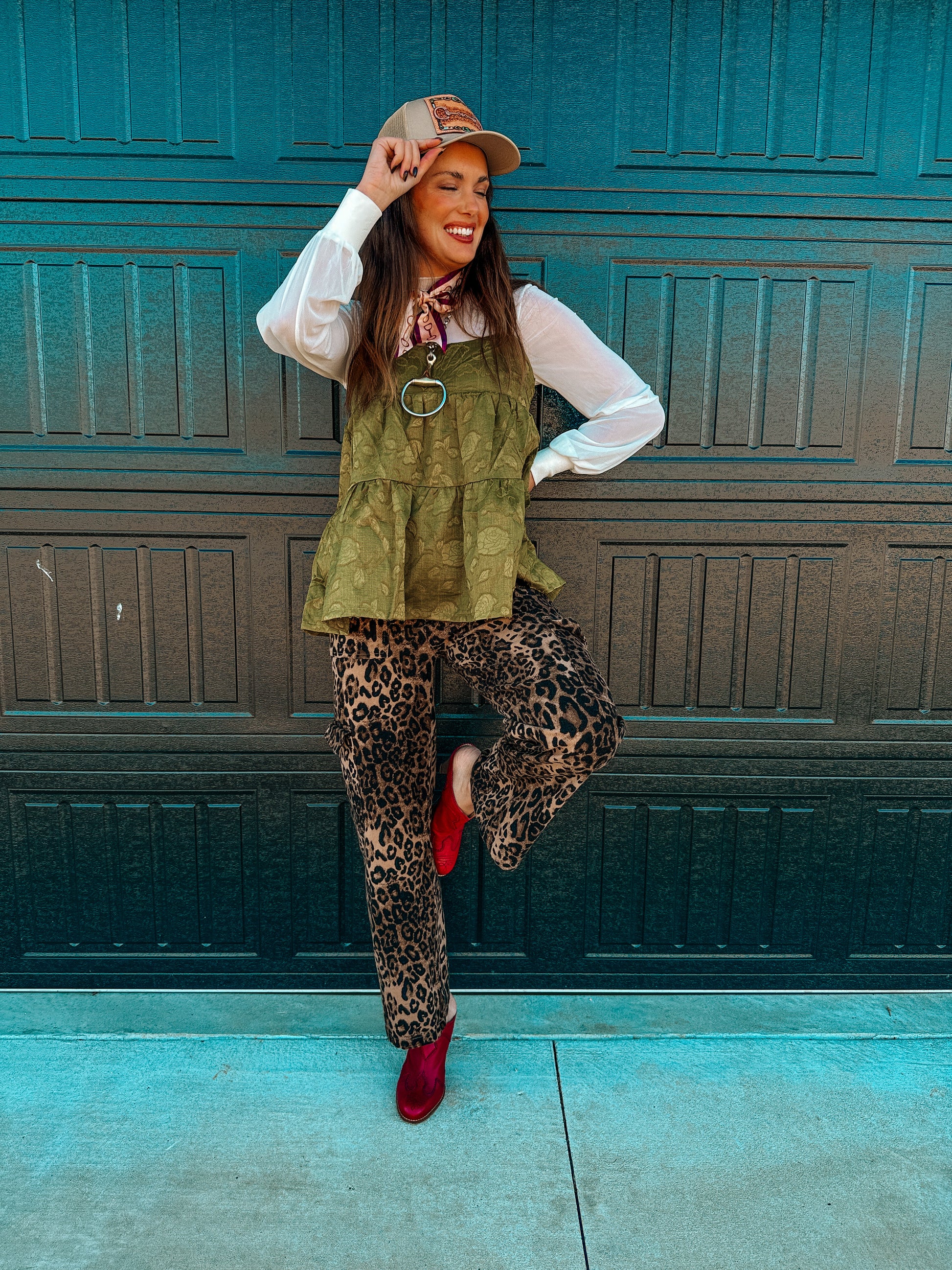 Tiered Jacquard tank top paired with the “Poppy Pedal Blouse” under!
