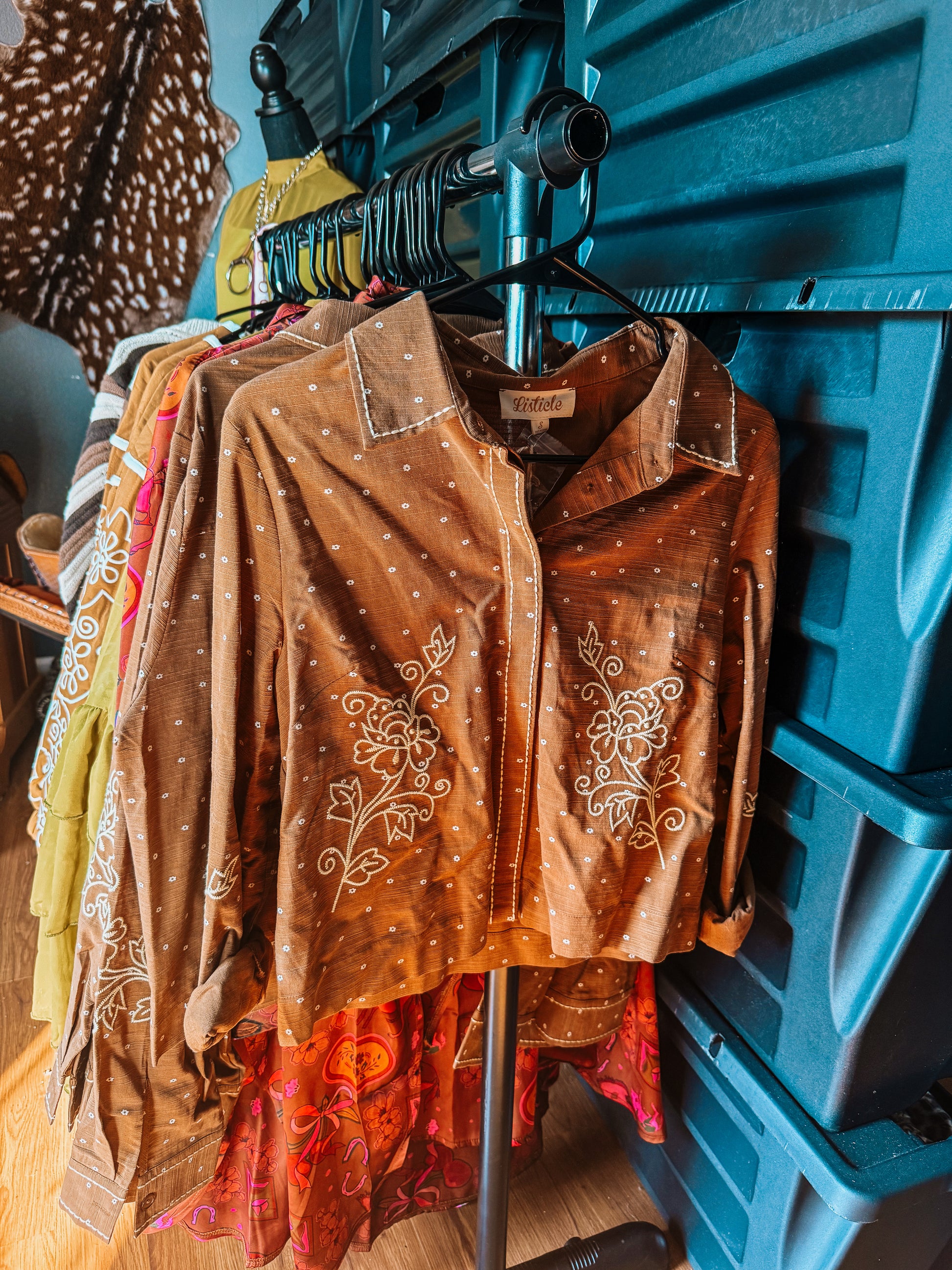 Lightweight Woven Cotton: Soft and breathable cotton fabric finished with tiny dotted weaves - Intricate Embroidery: Floral-inspired embroidery at the chest, sleeves, and cuffs adds handcrafted charm - Western Stitching Details: Subtle topstitching and structured collar give this piece a true Western flair - Cropped Hemline: Slightly boxy cut with a flattering, tuck-friendly length - Button-Front Closure: Classic shirt styling with button cuffs for versatility.
