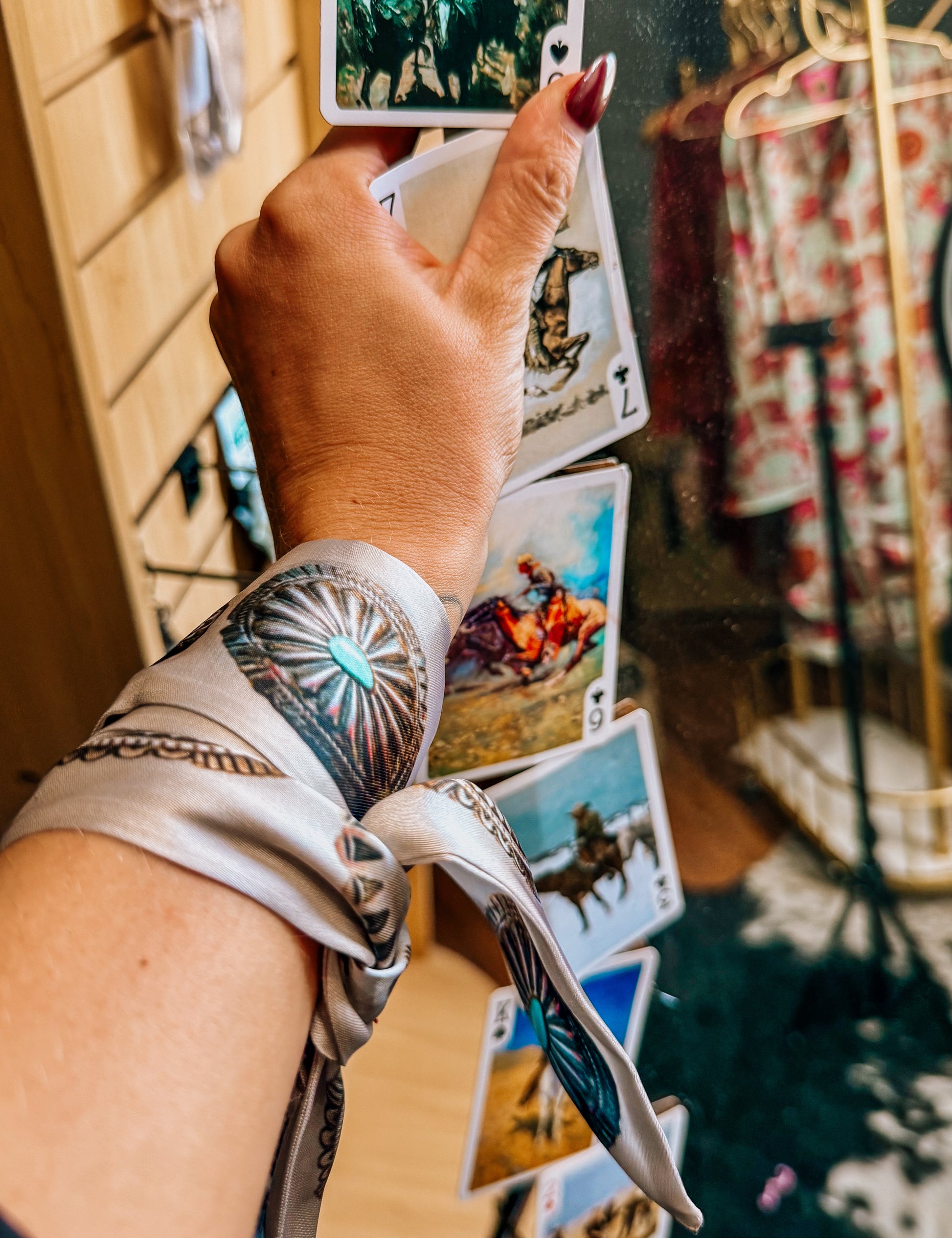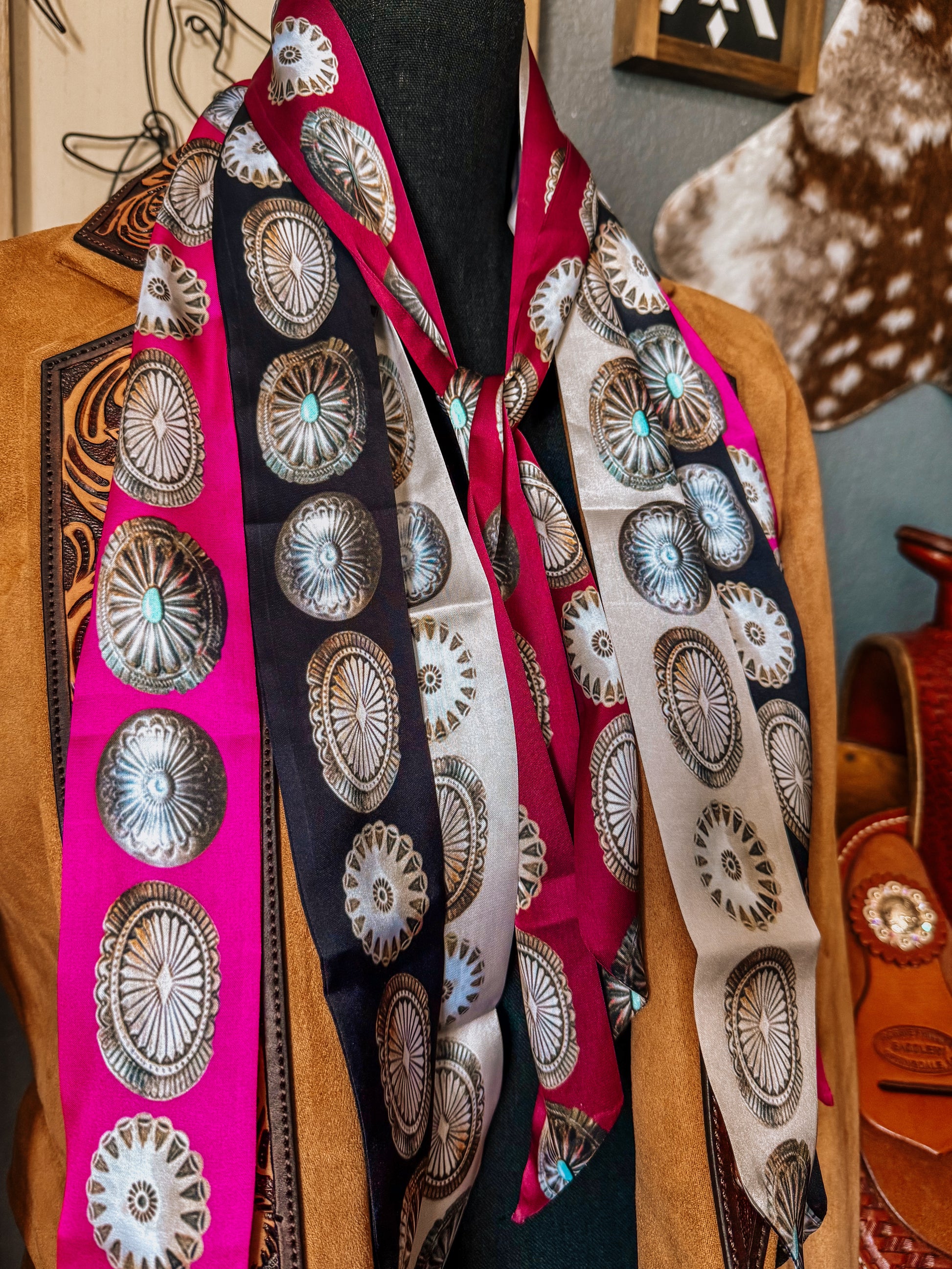 The Big Concho Twilly is simple and easy to incorporate into any outfit.... from adding to your neckline to wrapping around your wrist several times along with some silver cuff bracelets. And don't forget adding a Fringe Twilly to your favorite purse handle. One of my all time favorite scarves is a Twilly I purchased years ago. A great way to add color for a more minimalist look!