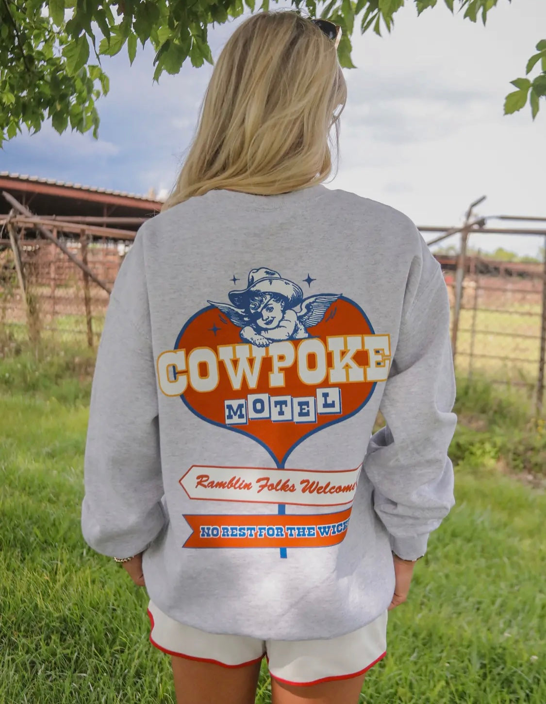 All ramblin' folks are welcome at the Cowpoke Motel! This crewneck sweatshirt features a front and back design with heart, cherub and vintage motel sign!
