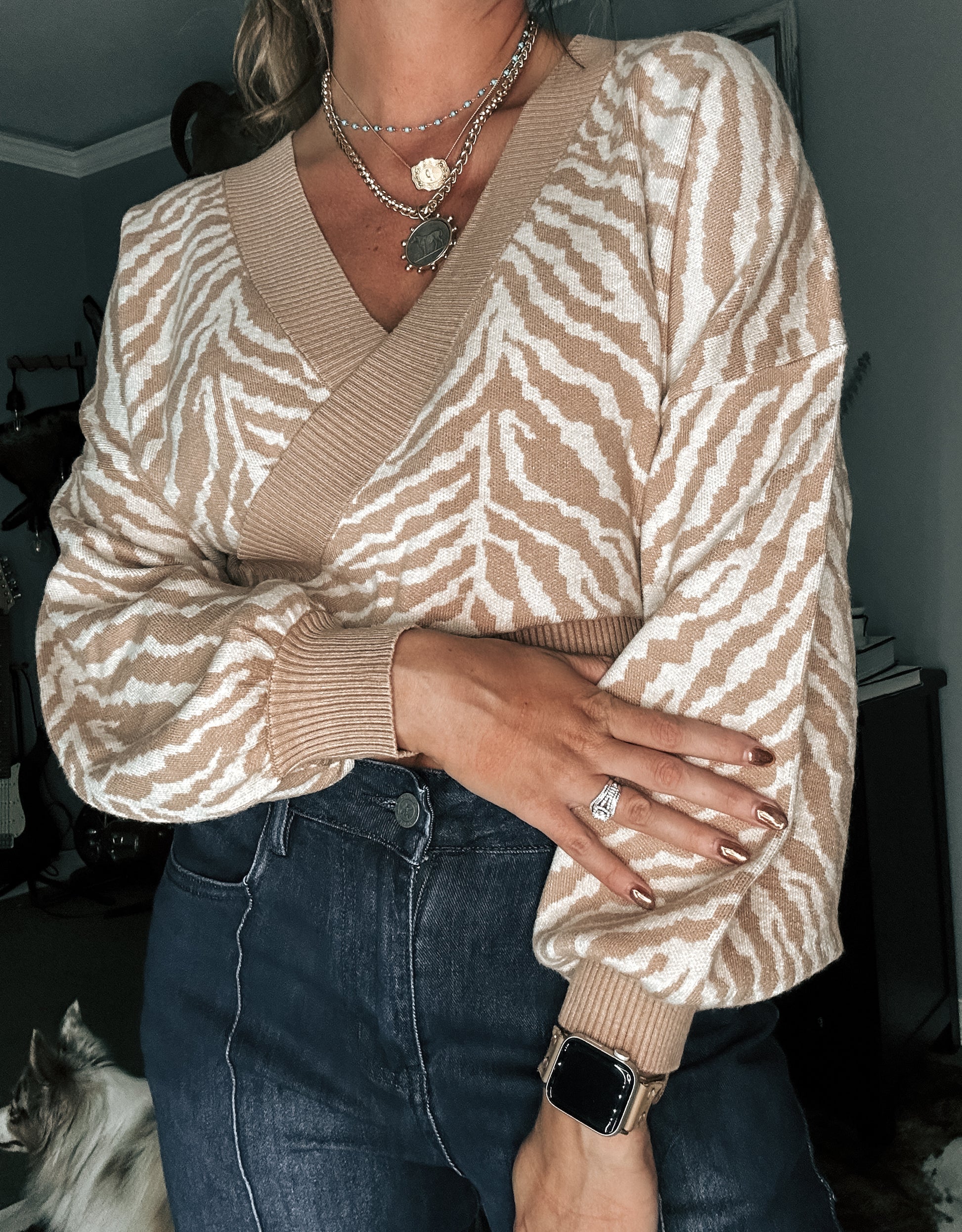 A zebra-print knit sweater with the following features: