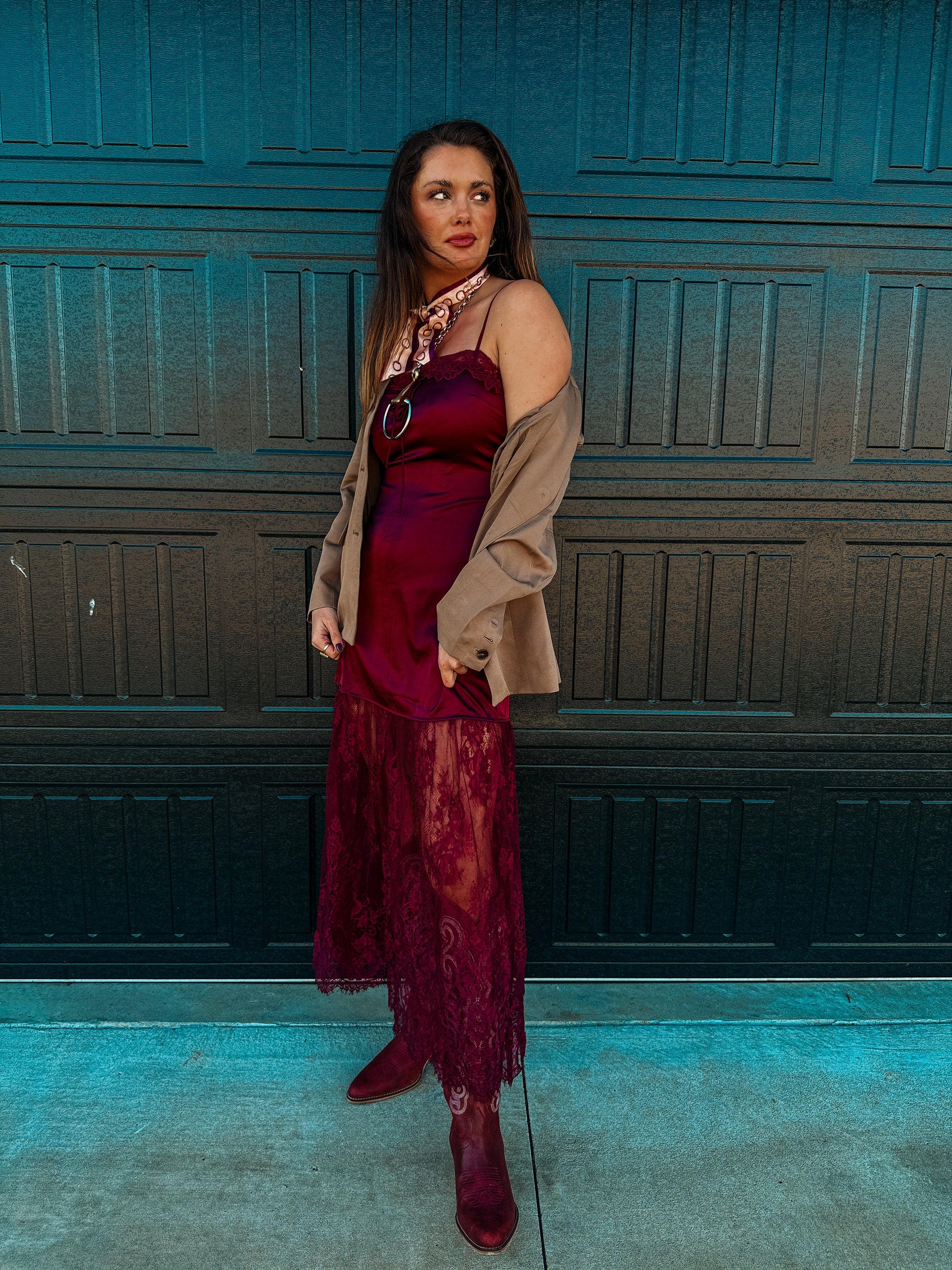 Sheer floral lace skirt overlay creates airy movement and contrast.