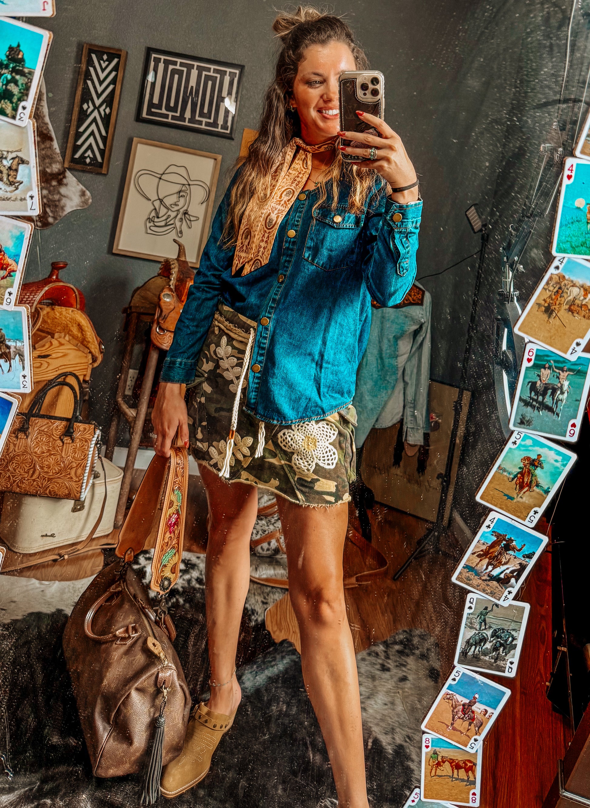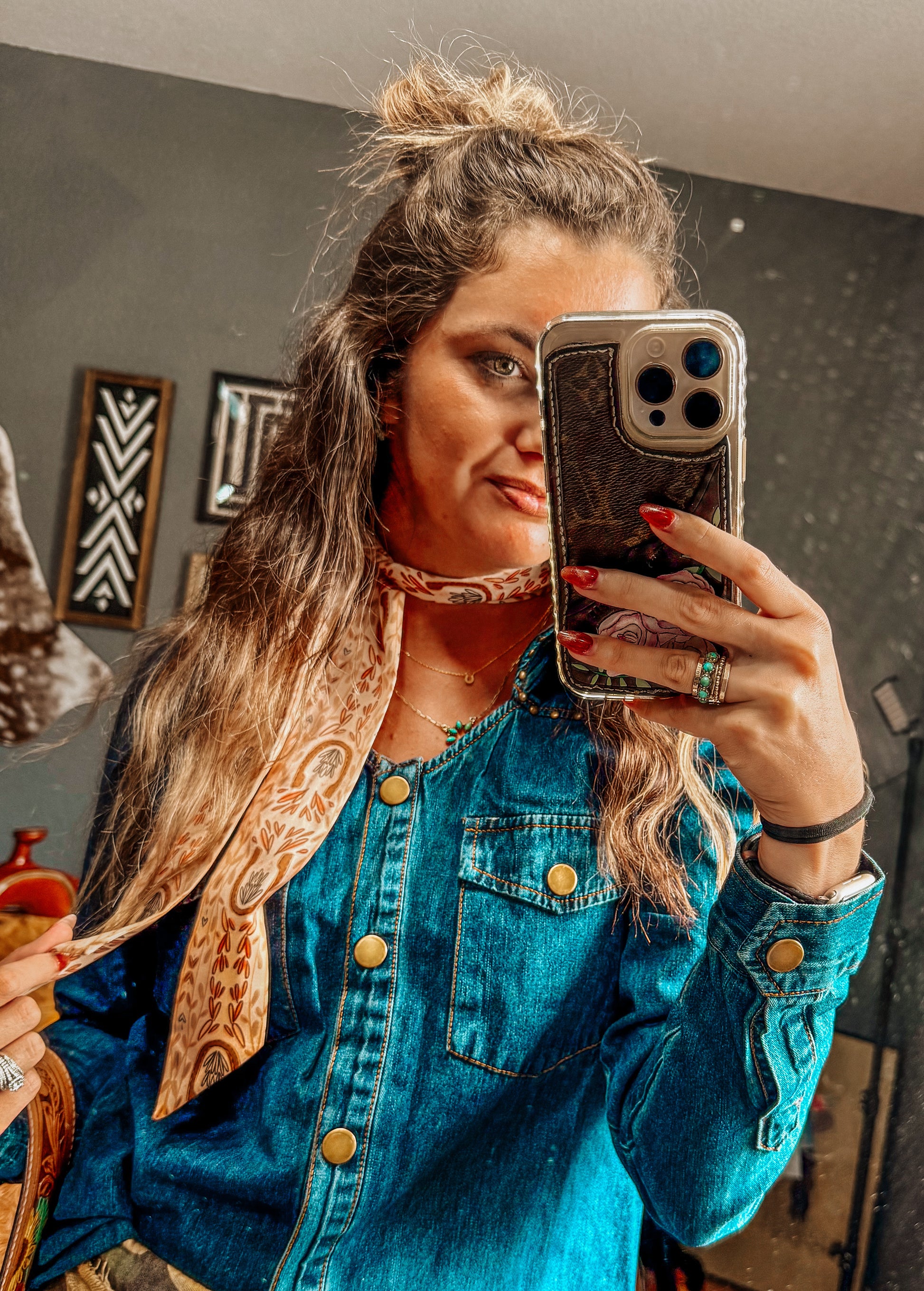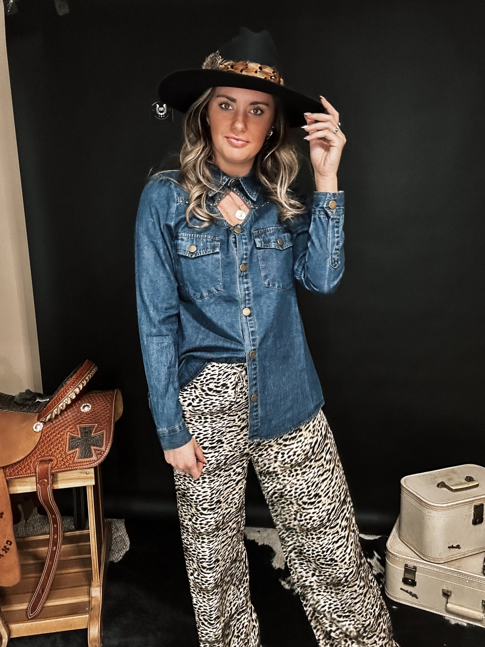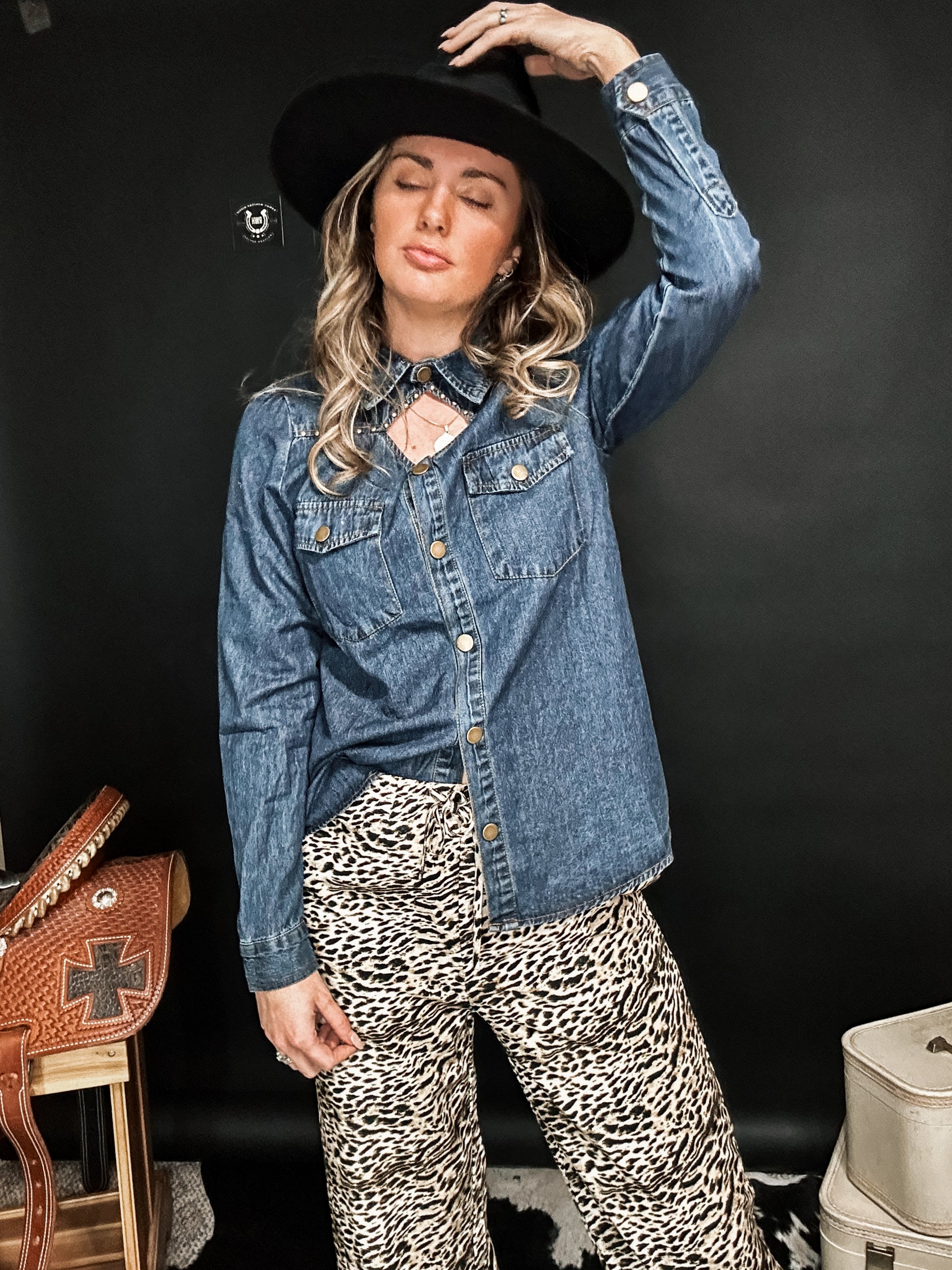 Get ready to make a statement with our Keyhole Denim Button Up! This unique shirt features a washed chambray design with a snap-up front and trendy cut outs at the neck. Studded details on the collar add an extra edge to this playful blouse.
