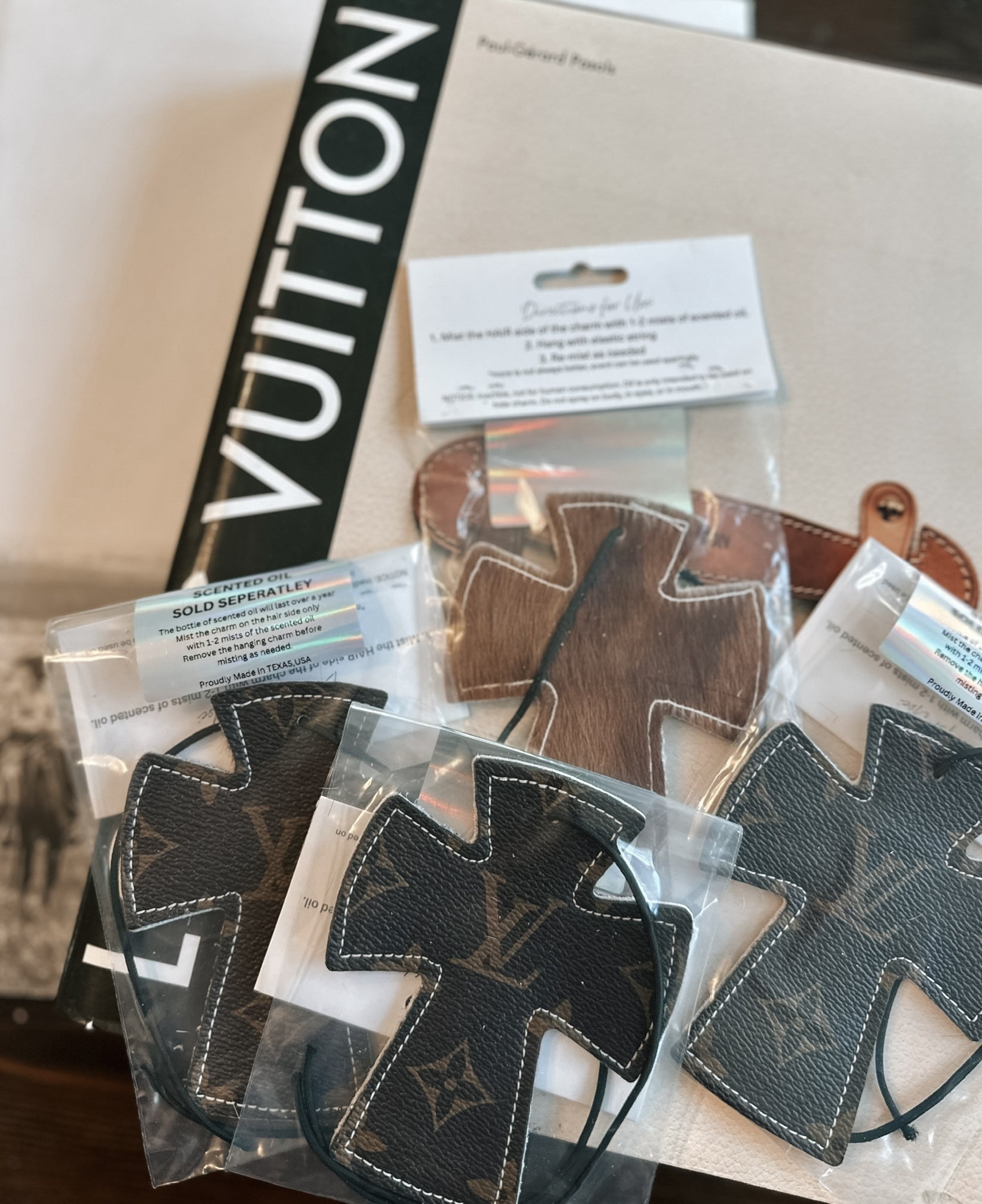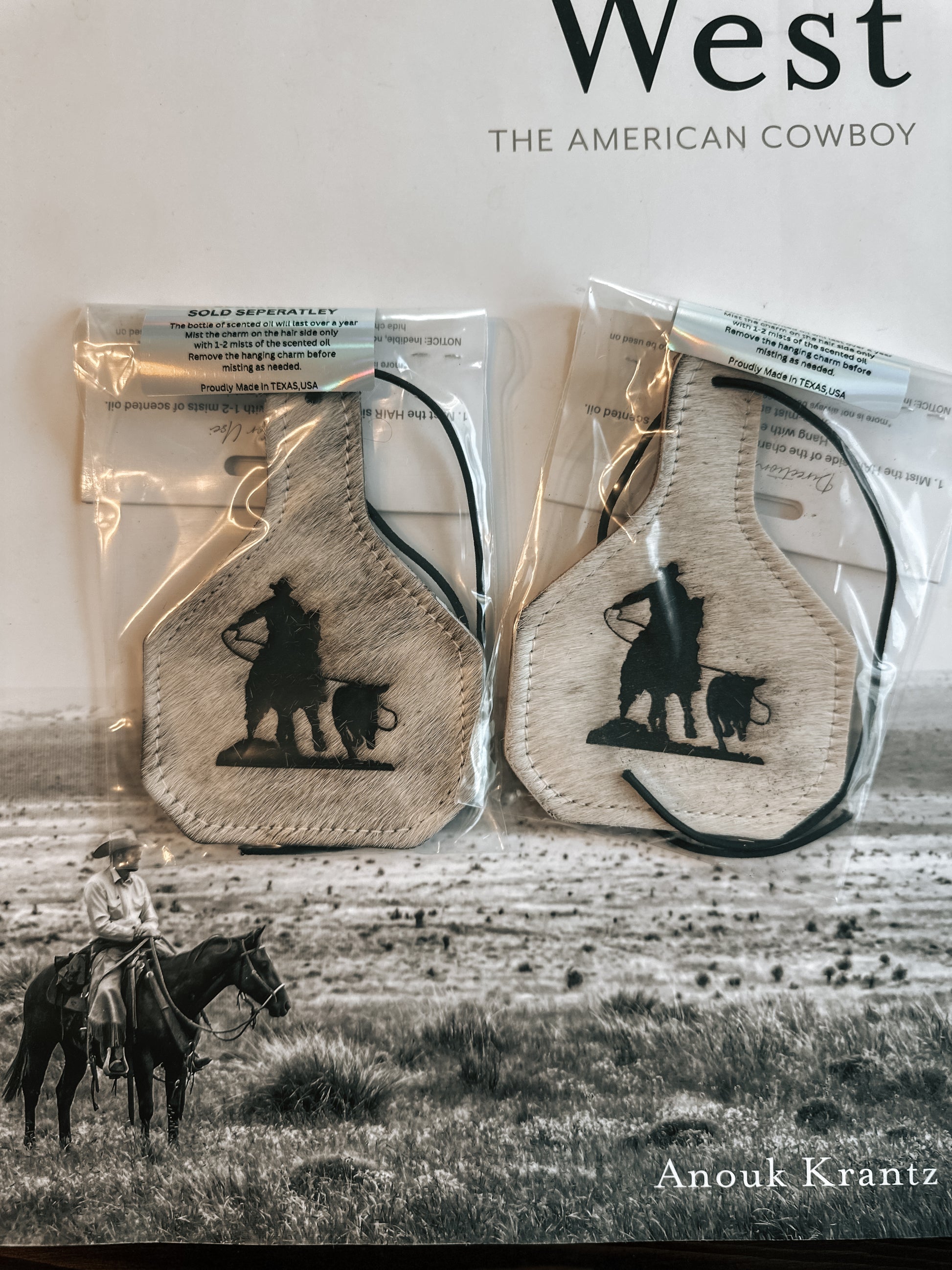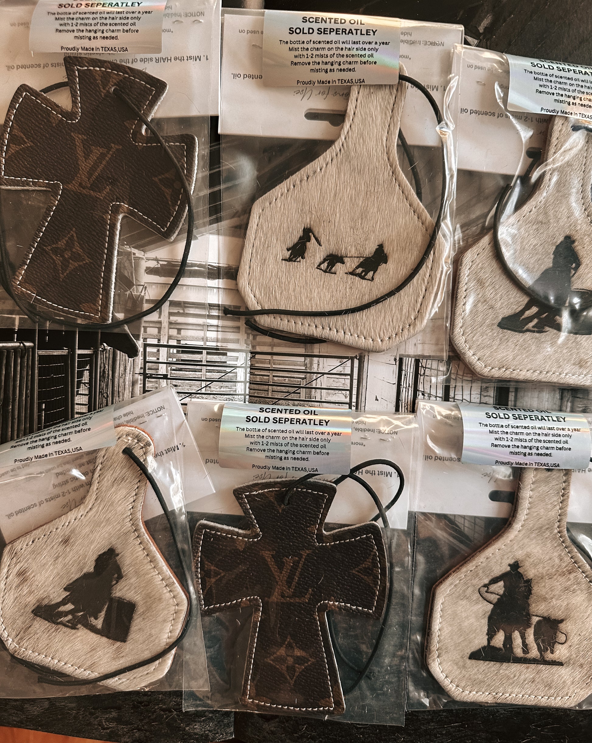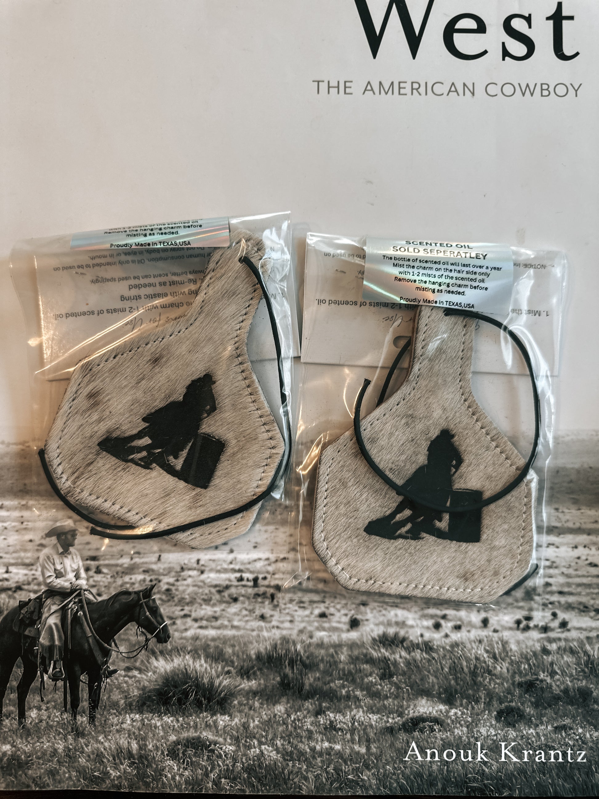 reSCENTit CAR CHARMS ARE MADE OF LEATHER & COWHIDE IN A FAMILY BOOT SHOP IN PANHANDLE TEXAS.