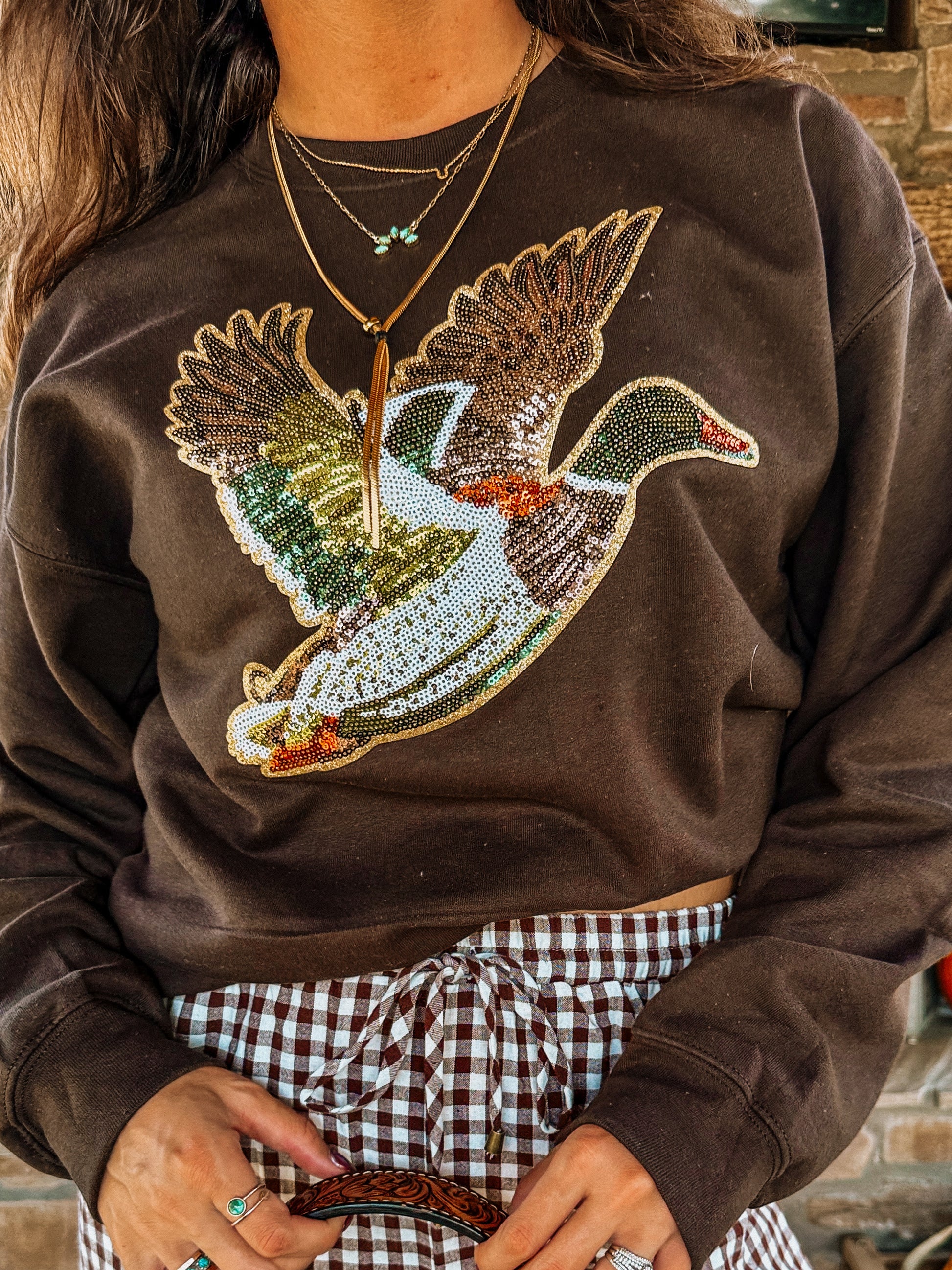Sequence mallard duck patch on a 50-50 Cotton soft, blend brown sweatshirt.