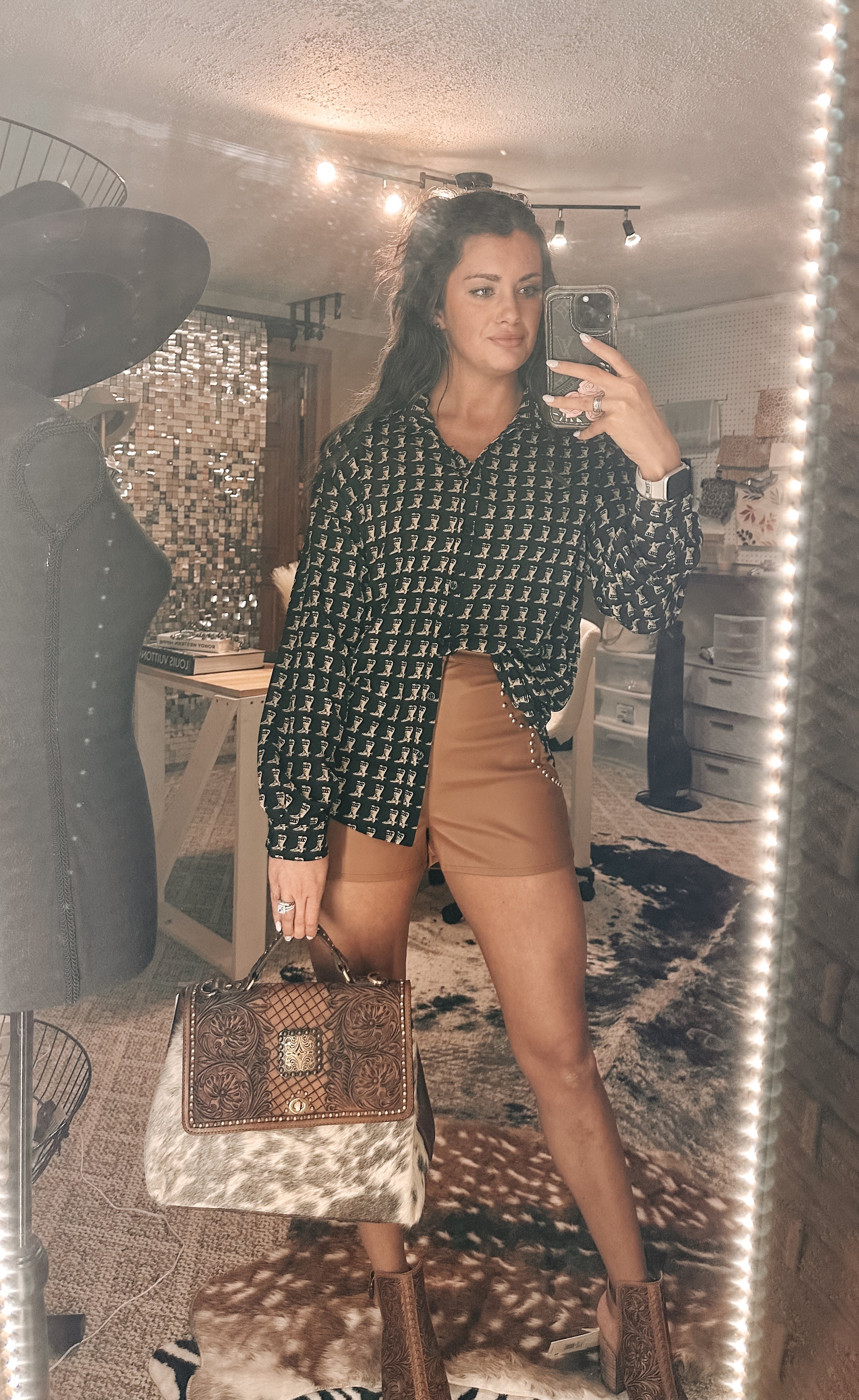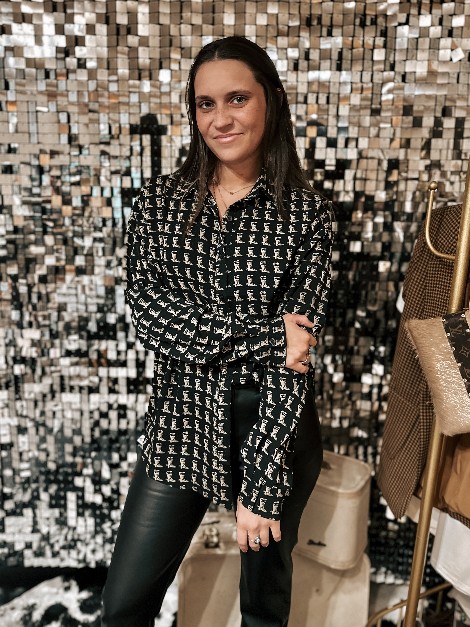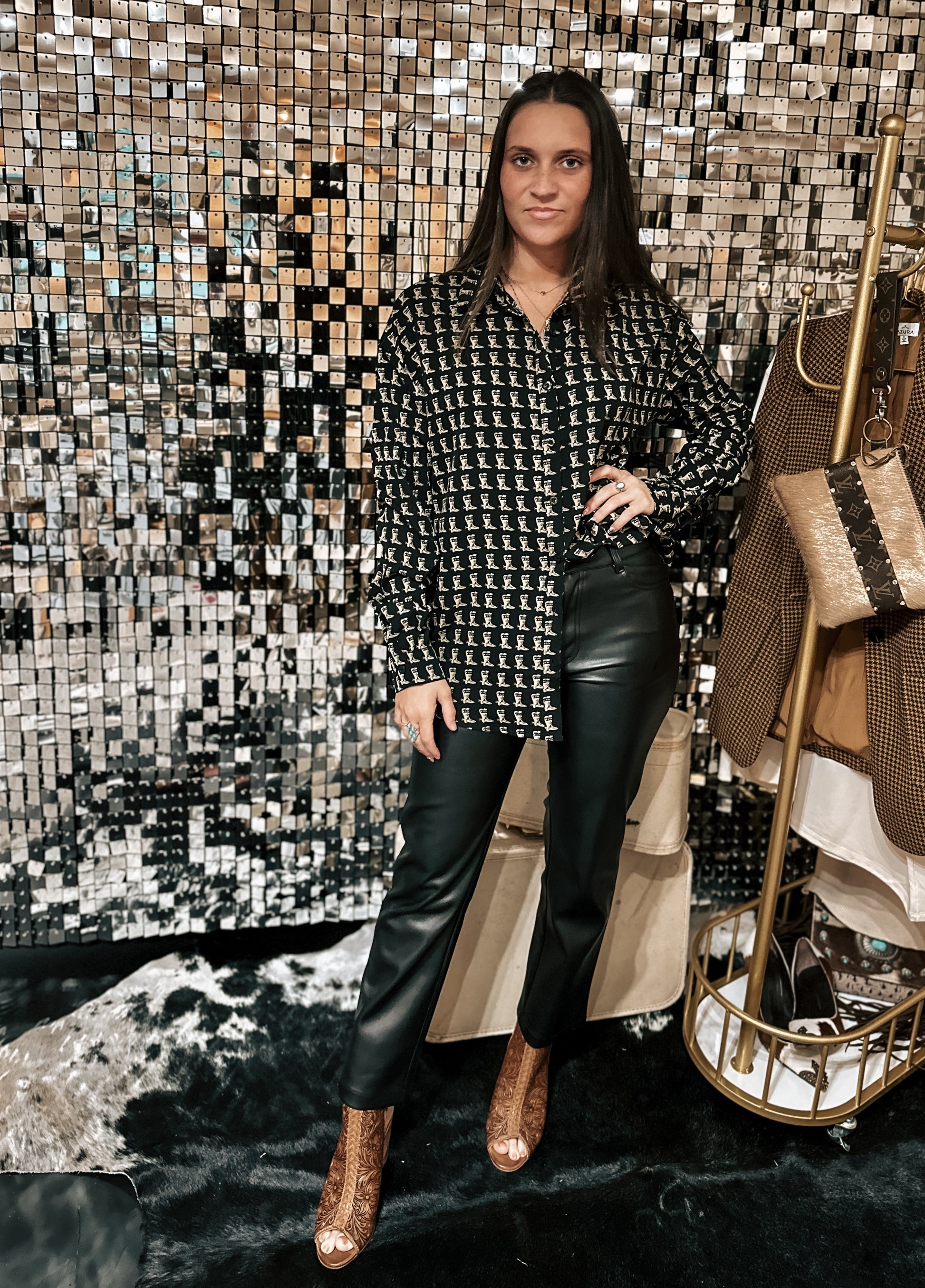 Black button up with small tan cowboy boots.