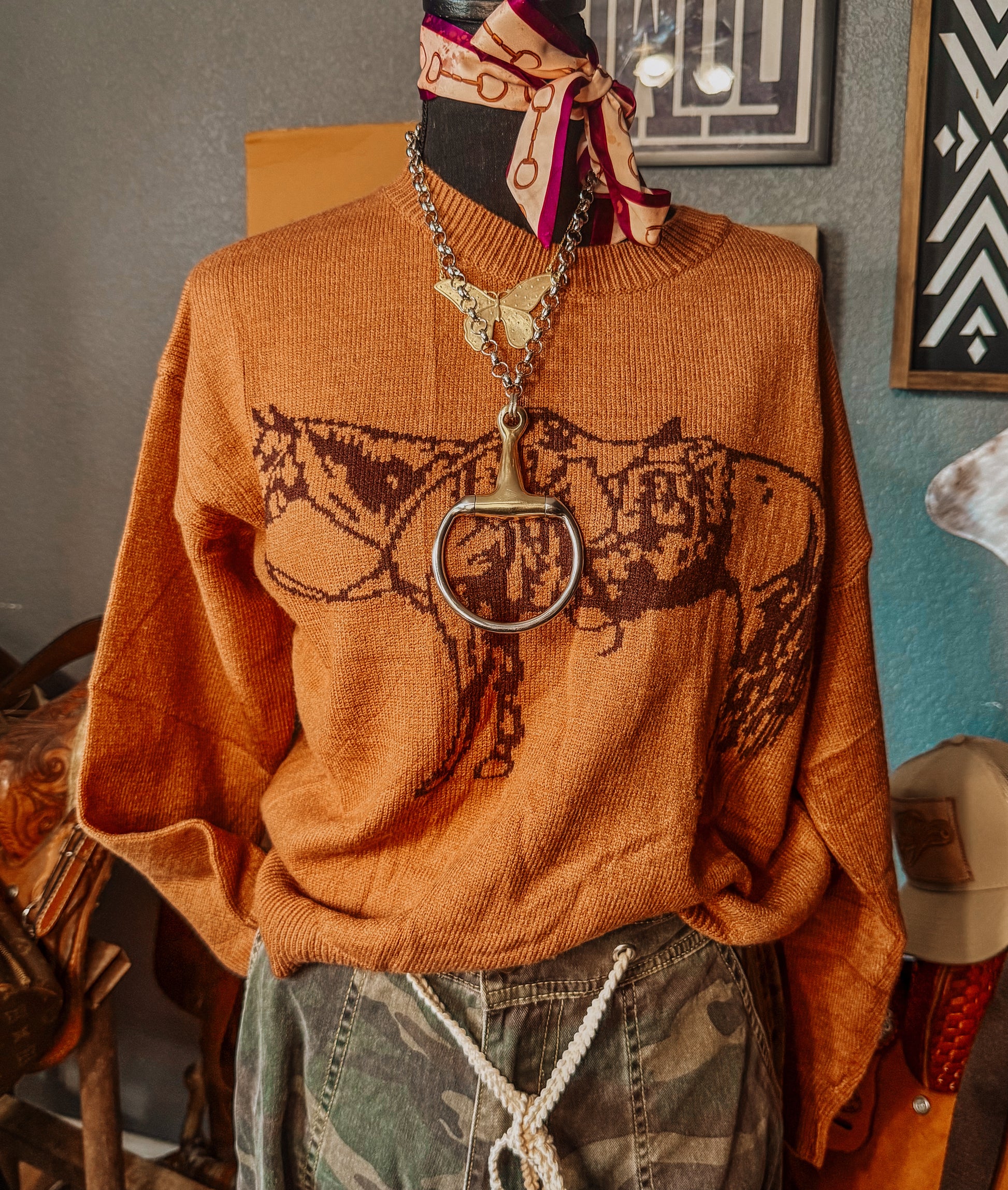 Jacquard knit horse graphic long sleeve sweater. Super soft knit with drop shoulder style. 50% Viscose, 28% Polyester, 22% Polyamide