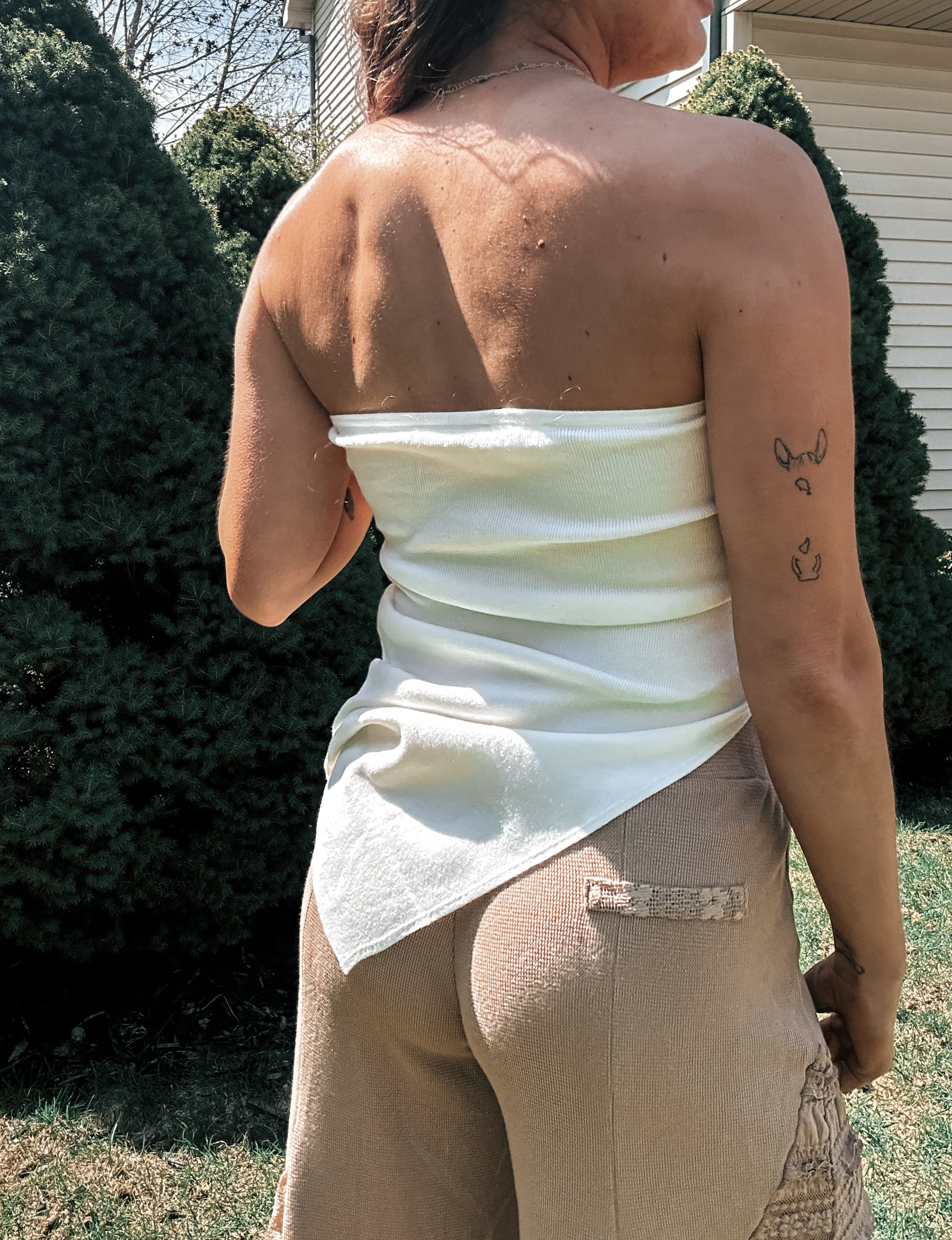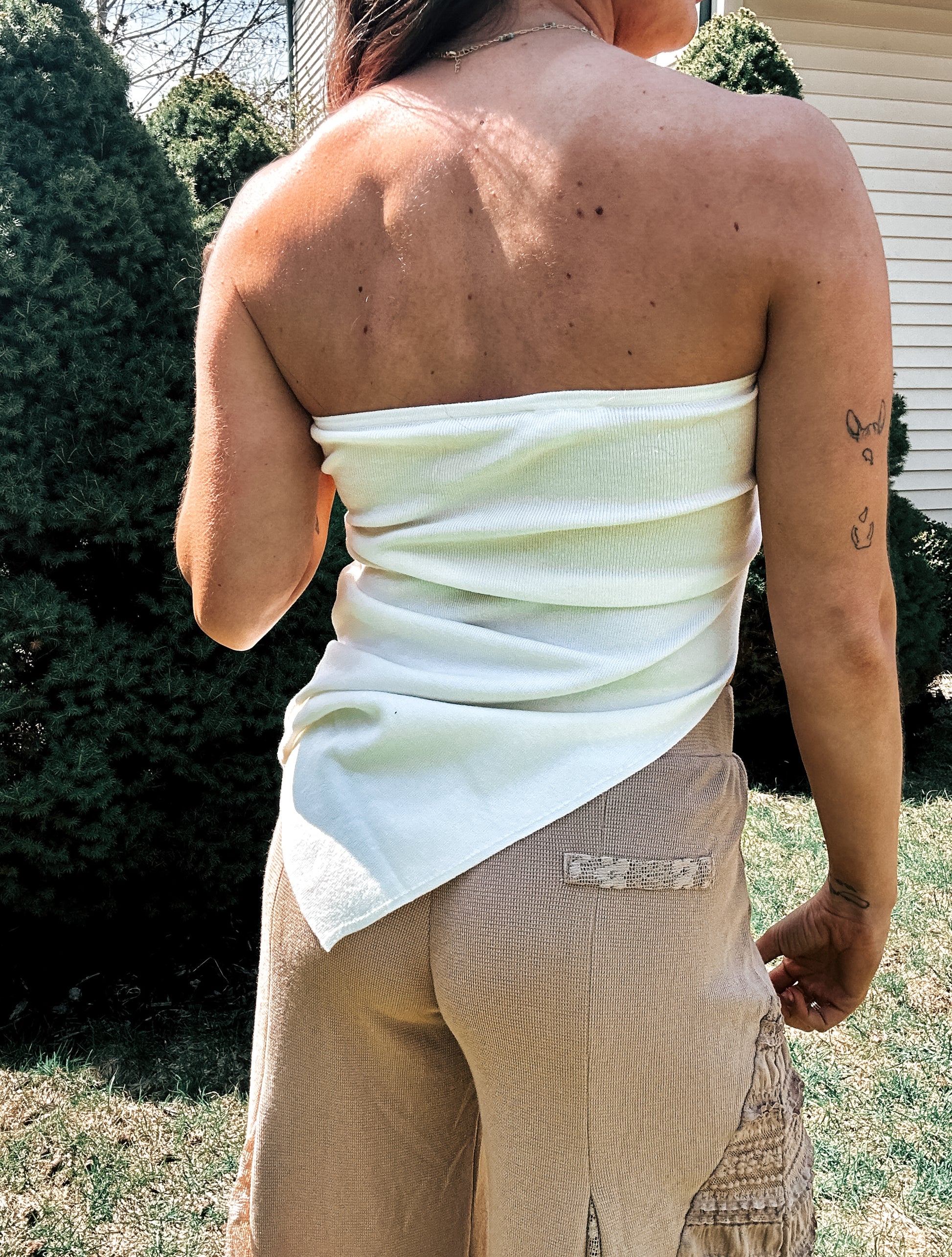 Strapless solid-knit tube top that offers a minimalist design with a non-slip elastic grip band to keep it securely in place. It features a sleeveless, longline silhouette with a chic side-split asymmetrical hem.