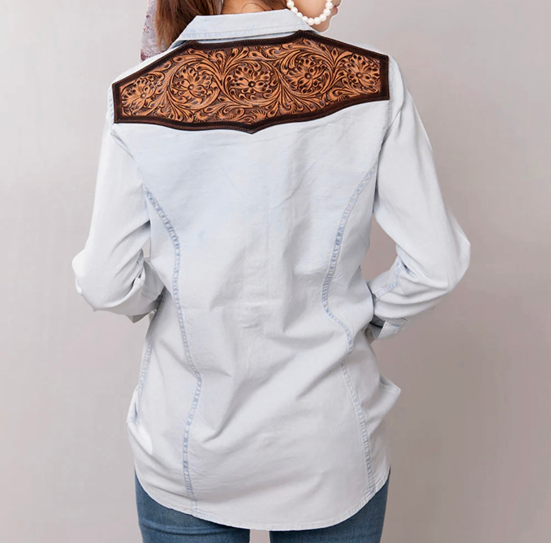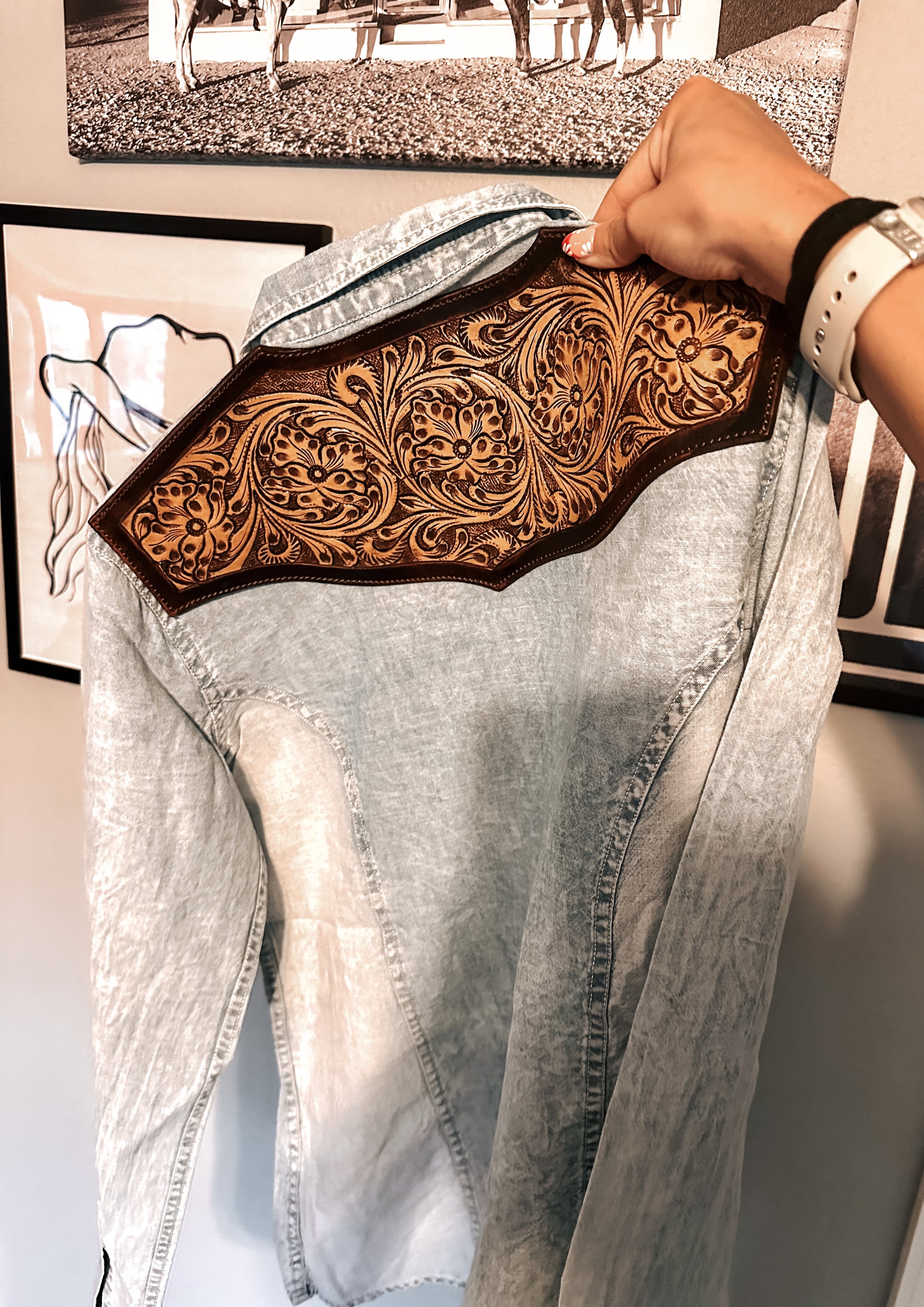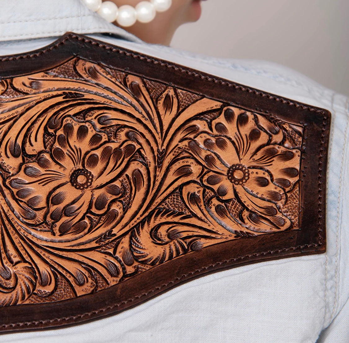 Vegetable tanned American Genuine Cowhide Leather. trims. Detailed Hand tool, carved and finally antique hand finished.