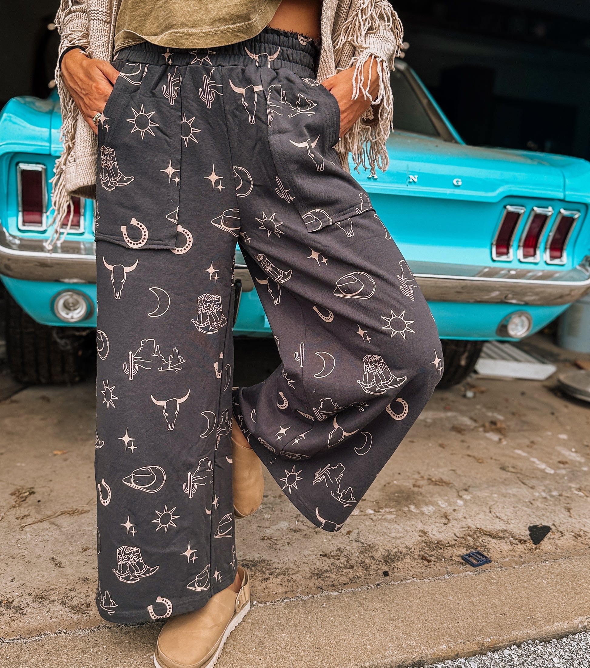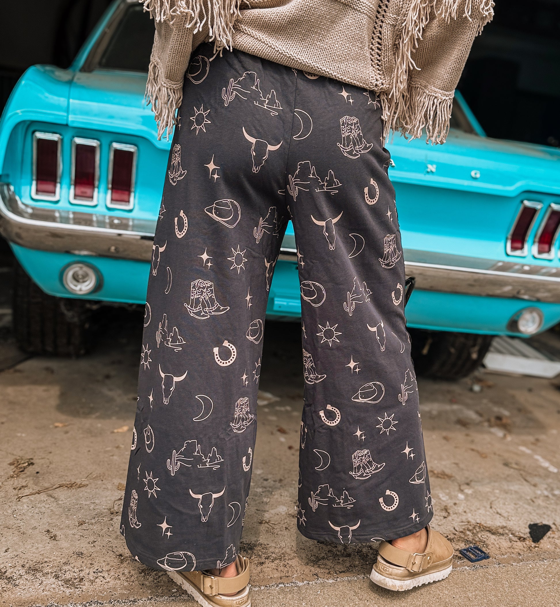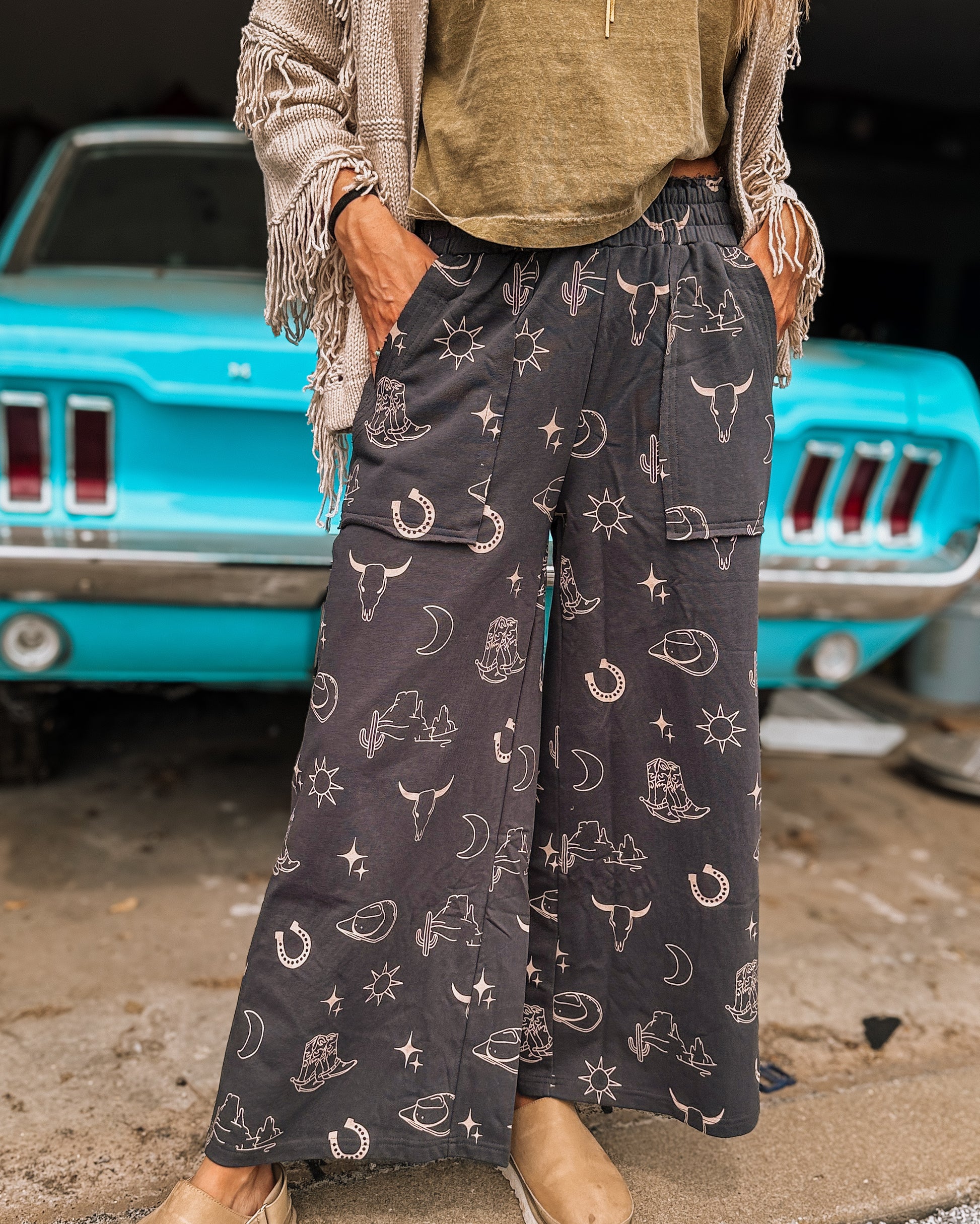 French Terry Wide Leg Elastic Waistband Pants With Western Graphic Print & Side Pockets. Runs true to size model 5.6” shown in small.