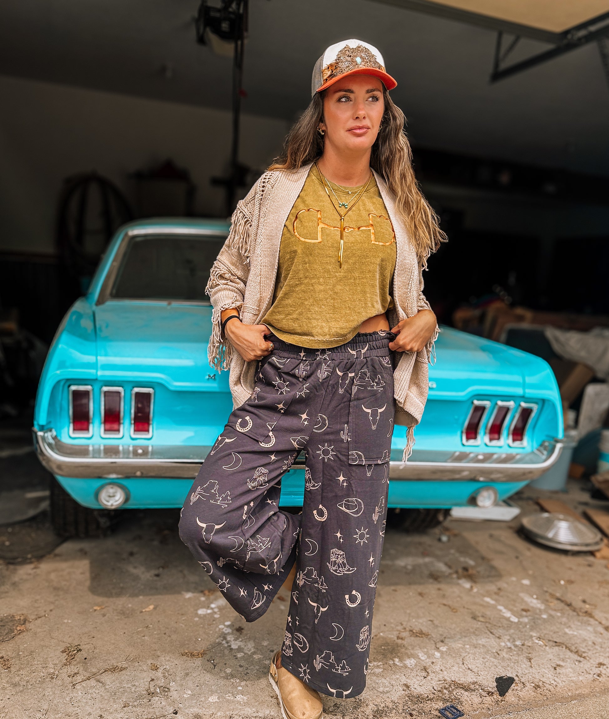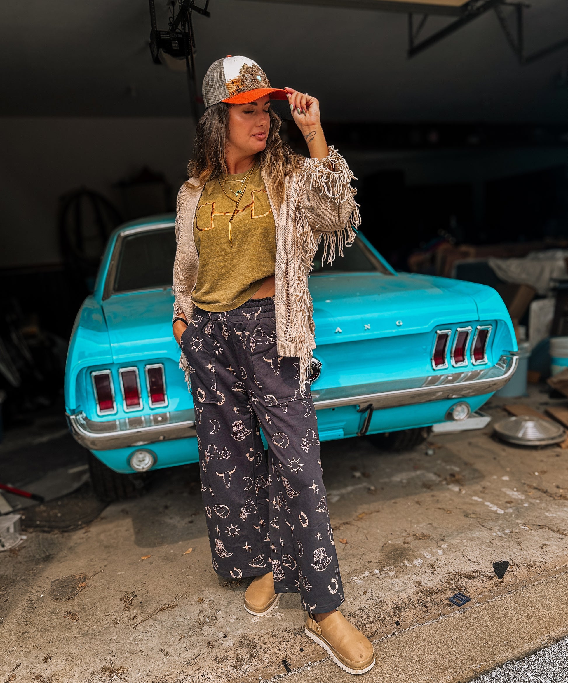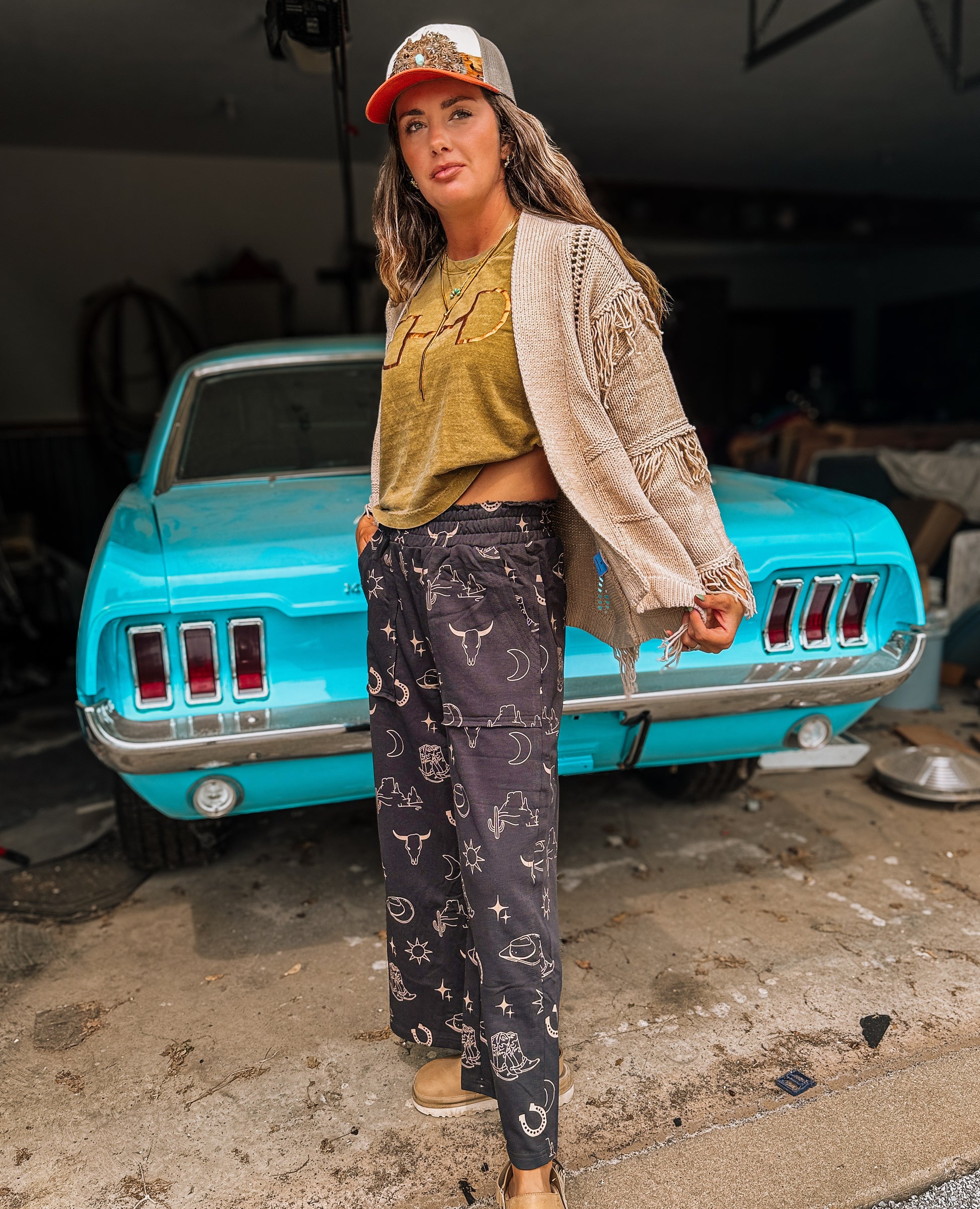 French Terry Wide Leg Elastic Waistband Pants With Western Graphic Print & Side Pockets. Runs true to size model 5.6” shown in small.