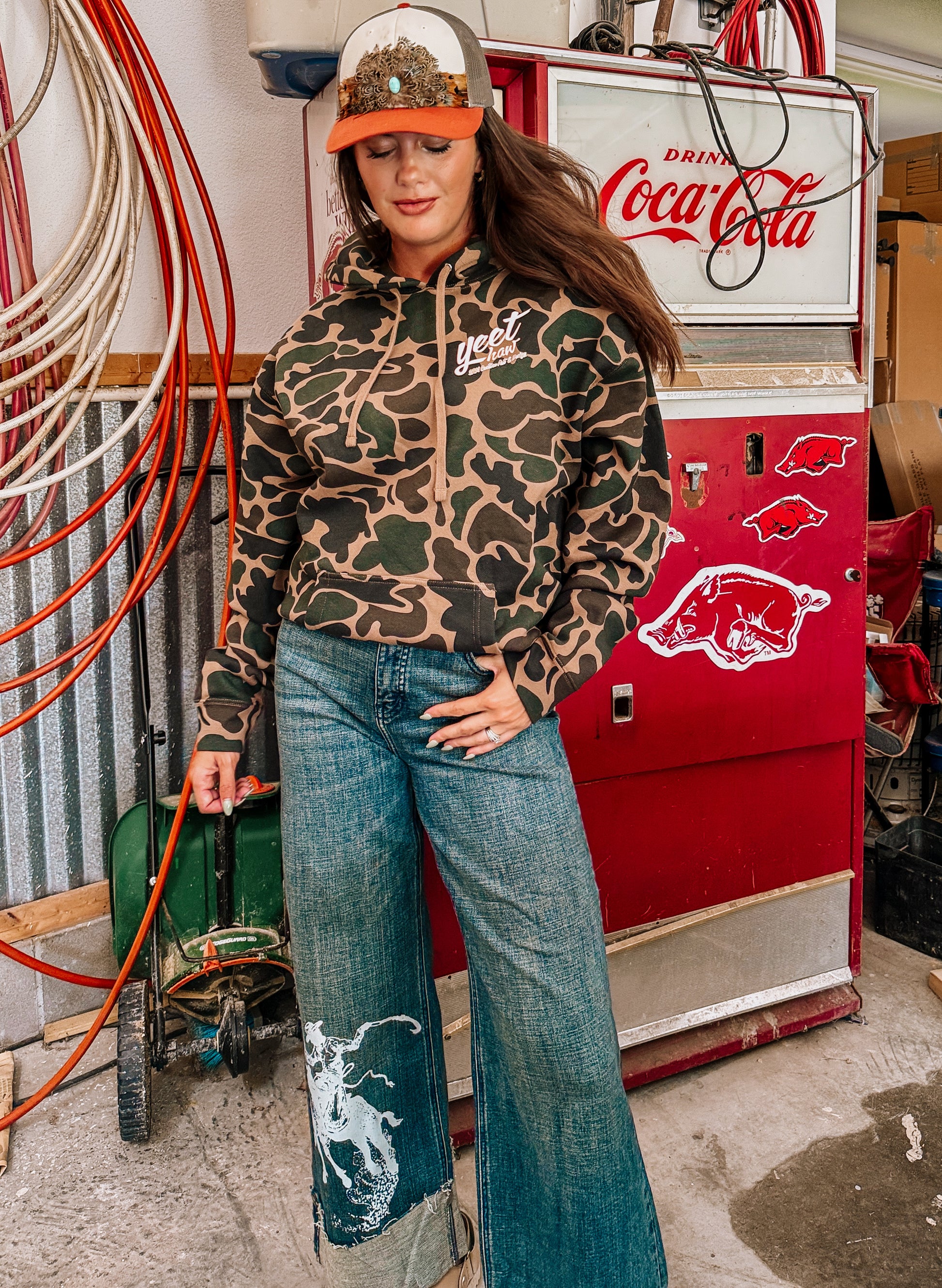 Stay cozy and stand out with the Yeet Haw Hoodie, featuring a bold duck camo pattern in orange and crisp white. This thick, comfy hoodie is perfect for chilly days when you want to combine warmth with a splash of fun style. Whether you're out on an adventure or just lounging, it's your new go-to for playful comfort.